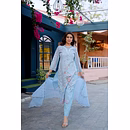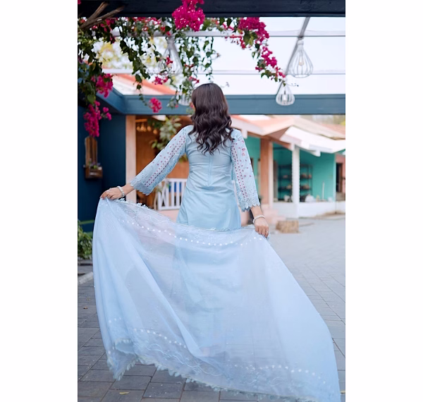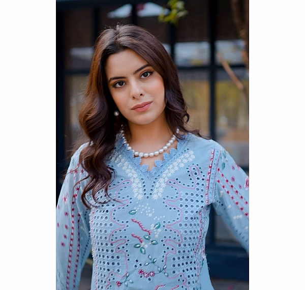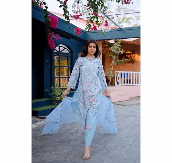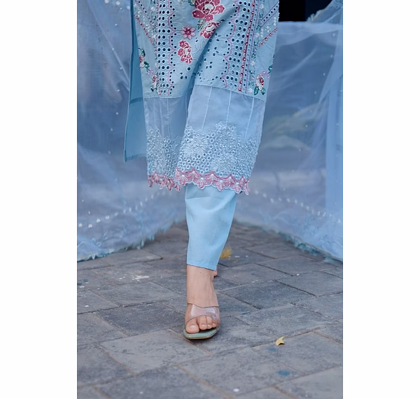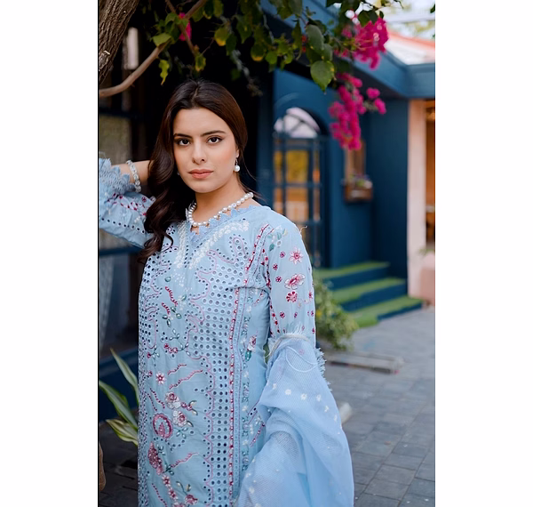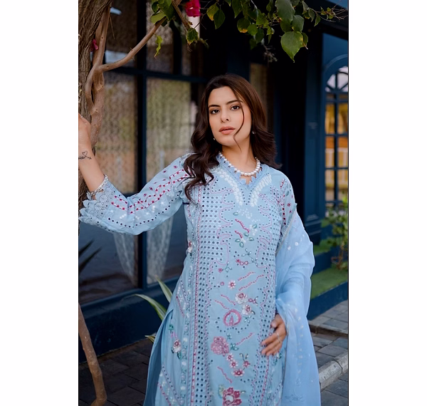 Indulge in sophistication with the Sky Blue Premium Quality Unstitched Suit featuring intricate heavy cutwork. Perfect for comfort, party occasions, and exuding elegance.
