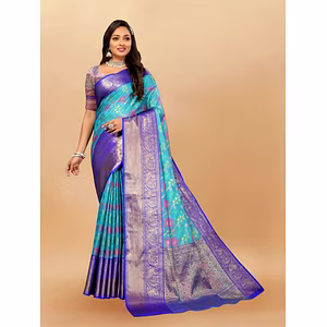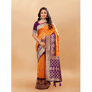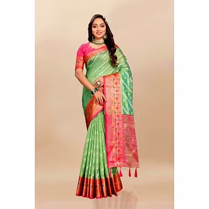 Experience the epitome of elegance with our Soft Cotton Saree, an exquisite piece that seamlessly marries tradition with contemporary aesthetics. This saree is crafted from the finest quality cotton, ensuring a soft, breathable fabric that drapes gracefully to enhance your silhouette. The saree is adorned with intricate Meenakari work, a traditional craft known for its colorful detailing and fine artistry. The Meenakari designs provide a vibrant and lively appeal, making the saree a perfect choice for festive occasions and special gatherings. Adding to the allure is the rich zari pallu, which glistens with every movement. The zari work is meticulously woven, showcasing opulent patterns that exude a royal charm. The pallu's grandeur is further accentuated by the contrast border, which frames the saree beautifully and provides a striking visual contrast. The border is designed with precision, featuring elaborate motifs that complement the overall design of the saree. This contrast not only enhances the aesthetic appeal but also adds a layer of sophistication, making it a versatile piece suitable for a variety of events. Accompanying the saree is a silk weaving blouse that perfectly complements the ensemble. The blouse is crafted from premium silk, offering a luxurious feel and a polished finish. Its design is kept elegant yet subtle, ensuring it pairs seamlessly with the richly adorned saree. The silk blouse is tailored to fit comfortably, allowing for ease of movement while maintaining a chic and stylish look. This Soft Cotton Saree with Meenakari, rich zari pallu, contrast border, and silk weaving blouse is more than just a garment; it is a statement of timeless beauty and refined taste. Whether you are attending a wedding, a cultural celebration, or an evening soiree, this saree promises to make you the center of attention, radiating grace and sophistication with every step you take.