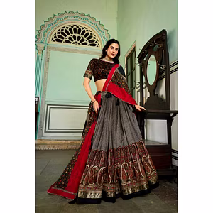 Introducing our exquisite Lehenga(Stitched) set, designed to make you feel like a queen on any special occasion. Crafted with utmost care and attention to detail, this ensemble is a true masterpiece. The Lehenga is made of soft Dola Silk fabric, known for its luxurious feel against the skin. The fully printed design is complemented by a striking contrast foil work border, adding a touch of elegance and sophistication. With a waist that is supported up to 42 inches, it ensures a comfortable and flattering fit for all body types. To enhance the overall appeal, the Lehenga is finished with a drawstring closure adorned with heavy handmade tassels and a zip for added convenience. The stitching is meticulously done with canvas and attached with Can Can, providing volume and grace to the attire. With a length of 41 inches and a flair of 3.8 meters, this Lehenga is sure to make a lasting impression. Accompanying the Lehenga is an unstitched Blouse made of the same high-quality Dola Silk fabric. The blouse features a contrasting design with foil work on the sleeves, perfectly complementing the Lehenga. With a length of 1 meter, it can be tailored to your desired style, ensuring a personalized and flattering fit. Completing the set is a Dupatta made of soft Dola fabric, featuring exquisite foil work and tassels. A backside supporting Patta adds a unique touch to the overall look. With a length of 2.35 meters, the Dupatta adds an element of grace and charm to the ensemble. This package contains the Lehenga, Blouse, Dupatta, drawstring with zip, and tassels, offering everything you need for a complete and enchanting look. With a weight of 1.200 kg, it is lightweight and comfortable to wear throughout the day or night. Indulge in the sheer beauty and elegance of our Lehenga(Stitched) set, and be prepared to steal the spotlight wherever you go. Elevate your style and make a statement with this captivating ensemble that effortlessly combines tradition with contemporary design.