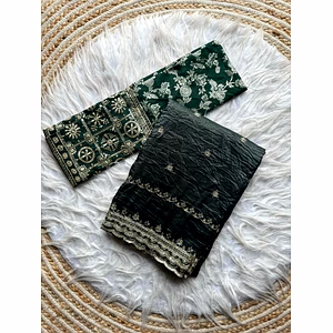 Introducing our Soft Gold Crush Saree with Sequin Work and Rich Cut Border - a stunning piece that will make you the center of attention at any occasion. This saree exudes elegance and sophistication, with its soft gold color that adds a touch of glamour to your ensemble. The crush fabric gives it a unique texture, making it stand out from the crowd. Our saree is embellished with exquisite sequin work, adding a subtle sparkle to your look. Whether it's a wedding, party, or any special event, this saree is sure to make a lasting impression. The sequins are intricately placed, creating a beautiful pattern that catches the light and enhances your natural beauty. The rich cut border is the epitome of luxury, with its intricate design and fine craftsmanship. It adds a touch of royalty to the saree, making you feel like a queen wherever you go. But it's not just about the looks - this saree is designed with your comfort in mind. The fabric is soft and lightweight, allowing you to move freely and comfortably throughout the day or night. With our Soft Gold Crush Saree with Sequin Work and Rich Cut Border, you'll not only look stunning, but you'll also feel confident and empowered. It's a timeless piece that will never go out of style, making it a worthy addition to your wardrobe. Don't miss out on this exquisite saree that combines elegance, style, and comfort. Order yours today and turn heads wherever you go. Let our Soft Gold Crush Saree with Sequin Work and Rich Cut Border be your statement piece and make a lasting impression.