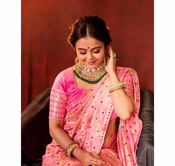 The Soft Lichi Silk Saree with Golden Jari and Green-Red Mina Design embodies the epitome of elegance and traditional craftsmanship. This saree is crafted from the finest Lichi silk, known for its soft texture and luxurious feel, making it a cherished addition to any wardrobe. The fabric drapes beautifully, ensuring it complements every body type and enhances the wearer's grace. The saree is adorned with an intricate Golden Jari work that adds a touch of opulence and regality. The golden threads are meticulously woven to create elaborate patterns, reflecting light in the most enchanting manner. This rich jari work is a testament to the skill and dedication of the artisans, making each saree a unique masterpiece. What sets this saree apart is the exquisite Green-Red Mina design that runs throughout the fabric. The Mina work, with its vibrant hues of green and red, offers a striking contrast against the golden jari, creating a visual symphony of colors. This design is not just a decorative element but a celebration of age-old traditions and the rich cultural heritage that India boasts of. The saree features a rich pallu that is the highlight of the ensemble. The pallu is generously embellished with intricate motifs and patterns, making it the focal point of the saree. When draped, the pallu flows gracefully, adding a majestic flair to the overall look. Accompanying this beautiful saree is a Jacquard border blouse. The blouse is designed to complement the saree perfectly, featuring a jacquard border that echoes the intricate patterns and designs of the saree. The blouse not only enhances the saree's beauty but also provides a comfortable fit, ensuring the wearer feels both elegant and at ease. Ideal for weddings, festivals, and special occasions, this Soft Lichi Silk Saree with Golden Jari and Green-Red Mina Design is a timeless piece that promises to make heads turn. It is more than just a piece of clothing; it is a symbol of tradition, craftsmanship, and the timeless beauty of Indian textiles.