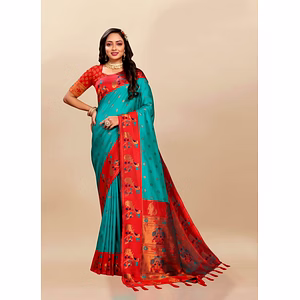 Soft Paithani Silk Saree with Meenakari Design, Zari Border & Silk Blouse Piece