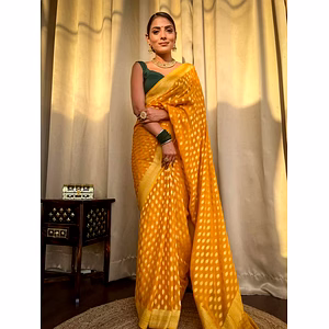 Introducing our stunning Soft Silk Saree: Elegant Khadi Georgette with Rich Zari Weaving. This exquisite piece of craftsmanship is designed to elevate your style and make you stand out from the crowd. Made from premium quality Khadi Georgette fabric, this saree is incredibly soft, lightweight, and comfortable to wear. It drapes beautifully, accentuating your feminine curves and giving you an elegant silhouette. The rich Zari weaving adds a touch of opulence and grandeur to this saree. Intricate and delicate, the Zari work is meticulously done by skilled artisans, ensuring every detail is perfect. The shimmering gold and silver threads create a mesmerizing effect, making you the center of attention at any event or occasion. With its timeless design and classic color options, this Soft Silk Saree is versatile and can be styled in numerous ways. Whether you prefer a traditional look or a modern twist, this saree effortlessly adapts to your personal style. Not only does this saree look stunning, but it is also built to last. The high-quality fabric and craftsmanship ensure durability, so you can enjoy wearing it for years to come. Experience the ultimate blend of elegance, luxury, and comfort with our Soft Silk Saree: Elegant Khadi Georgette with Rich Zari Weaving. Make a statement and leave a lasting impression wherever you go. This saree is a true embodiment of grace, style, and sophistication.