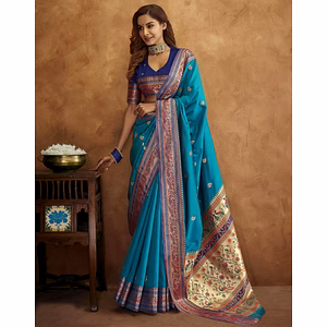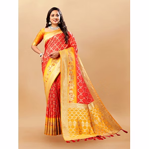 The Soft Silk Saree with Gold Zari Lehriya is a splendid embodiment of traditional elegance and luxurious craftsmanship. This exquisite saree is woven with the finest silk, ensuring a soft, smooth texture that drapes beautifully around the wearer. The silk used in this saree is known for its durability and luster, making it a perfect choice for special occasions and festive events. The saree features a classic Lehriya pattern, created with intricate gold zari work. The Lehriya, a traditional Rajasthani design, adds a dynamic and vibrant appeal to the saree, with its wave-like patterns symbolizing the undulating sands of the desert. The gold zari work is meticulously woven into the fabric, providing a rich and opulent look that catches the light beautifully, adding a touch of sparkle and sophistication to the overall appearance. Adding to the grandeur of the saree is the rich Meenakari weaving. This traditional technique, known for its colorful and intricate patterns, enhances the saree with its detailed and fine artistry. The Meenakari weaving is executed with precision, showcasing an array of vivid colors that contrast harmoniously with the gold zari, creating a balanced and visually striking design. The pallu of the saree is adorned with elegant tassels, adding a playful and stylish element to the ensemble. The tassels are carefully crafted, ensuring they complement the saree's overall design without overpowering it. The pallu, with its detailed work and tassels, becomes a focal point, perfect for showcasing when draped over the shoulder. Accompanying the saree is a matching silk blouse, designed to provide a cohesive and complete look. The blouse is tailored to fit comfortably while accentuating the saree’s elegance. Its silk fabric ensures a luxurious feel, and its simple design allows the saree’s intricate patterns and rich details to take center stage. This Soft Silk Saree with Gold Zari Lehriya, Rich Meenakari Weaving, and Tassel Pallu is a timeless piece that reflects traditional artistry and modern elegance. It is an ideal choice for weddings, festive celebrations, and other grand occasions, ensuring the wearer stands out with grace and poise.
