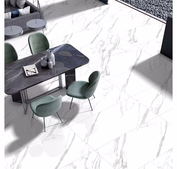 Crafted from high-quality glazed vitrified porcelain, Statuario Oro GVT tiles are not only aesthetically pleasing but also incredibly durable. Their low water absorption and scratch resistance make them perfect for high-traffic areas, both residential and commercial.