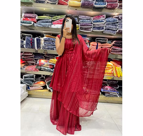 The Stunning Anarkali Set combines elegance and comfort to create the perfect outfit for any occasion. Crafted from polished georgette fabric, this set boasts a flawless fit that flatters any body type. The intricate detailing on the neckline and hemline adds a touch of sophistication to the overall look. Whether you're attending a wedding or a formal event, the Stunning Anarkali Set is guaranteed to turn heads. The flowing silhouette of the Anarkali top and the fitted churidar pants create a classic, timeless look that never goes out of style. But this set isn't just about style – it's also about comfort. The georgette fabric is soft and breathable, making it perfect for long events or hot weather. And the flawless fit ensures that you'll feel comfortable and confident all day and night. Overall, the Stunning Anarkali Set is the perfect choice for anyone who wants to look and feel their best. With its elegant design, impeccable fit, and comfortable fabric, this set is a must-have for any fashion-conscious individual. Whether you're dressing up for a wedding or simply want to add a touch of sophistication to your wardrobe, the Stunning Anarkali Set is the perfect choice.