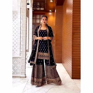 This stunning Foux Gorgette Sharara Set is a true feast for the eyes. Crafted with meticulous attention to detail, this ensemble showcases exquisite thread work that will leave you spellbound. The intricate embroidery is a testament to the skill and artistry of the craftsmen who brought this masterpiece to life. The Foux Gorgette fabric used in this set is known for its luxurious feel and delicate drape. It gracefully glides over your body, enhancing your curves and making you feel like a true diva. The rich, vibrant color adds to the allure of this ensemble, making it perfect for both daytime and evening events. The sharara, a traditional three-piece outfit, features a flared silhouette that exudes elegance and grace. The full stitch ensures a perfect fit, hugging your curves in all the right places while providing comfort and ease of movement. The wide-legged pants flow beautifully with every step you take, creating a mesmerizing effect. The highlight of this ensemble is the intricate thread work embellishing the entire set. The skilled craftsmen have painstakingly created captivating patterns using delicate threads of contrasting colors. The motifs and designs are inspired by traditional Indian craftsmanship, adding an element of cultural heritage to this contemporary piece. The attention to detail is evident in every stitch, as the thread work intricately adorns the neckline, sleeves, and pants of the sharara set. The combination of colors and patterns creates a stunning visual impact that is sure to make you the center of attention wherever you go. Whether you're attending a wedding, a festive celebration, or a special occasion, this Foux Gorgette Sharara Set is the epitome of elegance and style. Wear it with confidence and let its beauty speak for itself. You will undoubtedly make a lasting impression in this exquisite ensemble. So go ahead, indulge yourself in luxury and step out in style with this breathtaking sharara set.