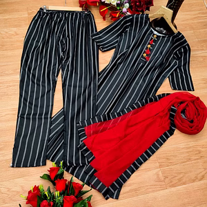 Introducing our latest fashion ensemble, a beautifully crafted outfit designed to make you look effortlessly stylish and feel incredibly comfortable. Made with the finest fabrics, this set features a top and pant made from luxurious RAYON material, ensuring a soft and smooth texture against your skin. The accompanying DUPATTA, also made from RAYON, adds an elegant touch to complete the look. Our designers have meticulously created this outfit to cater to various body types, offering sizes ranging from M(38), L(40), XL(42), to XXL(44). The elastic waist on the pant provides a comfortable and flexible fit, making it suitable for any body shape. The length of the top reaches a maximum of 45 inches, while the pant extends up to 38 inches, ensuring a flattering and modest appearance. With its fully stitched and ready-to-wear design, this outfit saves you time and effort, allowing you to effortlessly dress up for any occasion. The lightweight construction, weighing just 0.850 kg, ensures ease of movement and all-day comfort. Our product stands out from the crowd, not only due to its impeccable craftsmanship and high-quality materials but also because it embodies the perfect fusion of style and comfort. Whether you're attending a festive celebration, a casual gathering, or a formal event, this outfit will undoubtedly make a statement. Don't miss out on this exclusive opportunity to own a wardrobe staple that exudes elegance and sophistication. Embrace the beauty of our RAYON outfit and experience the pleasure of wearing something truly special. Order now and elevate your style to new heights!