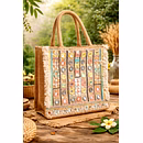 Celebrate traditional artistry with this Natural Jute Tote Bag beautifully adorned with vibrant multicolor mirror embroidery and intricate bead embellishments. Each bag is handcrafted by skilled artisans, reflecting heritage craftsmanship and fine detailing. The elegant fringe trim enhances its cultural charm, making every piece a unique work of art.