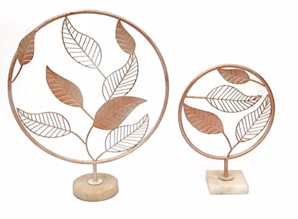 "Table Décor" comes in two sizes, with dimensions L- 15.50x4.75x19 inches and S- 10x4x13.50 inches. It is made of aluminum and marble, making it an elegant addition to your table setting.