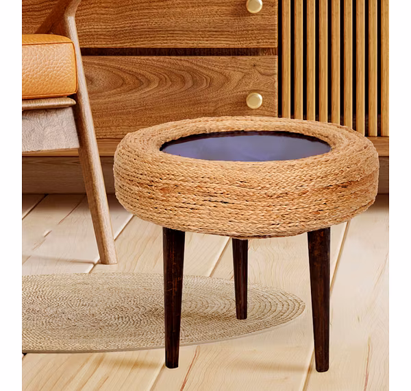 Handcrafted with hand-braided jute and adorning an elegant glass tabletop, that can be separated to reveal increased storage space, it functions as a table, footstool, prop, storage, and so much more. We can add artificial plants, String lights below the glass or pebble stones or any decoration can be placed on top.