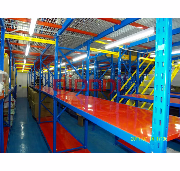 A racking system that features three levels of storage, perfect for industries that need to maximize space in smaller warehouses. This system provides easy access to materials at various levels.