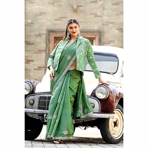 Introducing our Traditional Fancy Saree: a stunning combination of elegance and style. This saree is adorned with a beautiful sequence lace border and paired with a designer jacket style blouse, making it the perfect choice for any special occasion. The key feature of this saree lies in its intricate lace border, which adds a touch of glamour and sophistication. The delicate sequence embellishments further enhance its beauty, making it a truly eye-catching ensemble. But it's not just about the aesthetics. This saree offers a range of benefits that make it a must-have in your wardrobe. The jacket style blouse not only adds a contemporary twist to the traditional saree, but also provides a comfortable and flattering fit. The versatility of this design allows you to effortlessly transition from a formal event to a casual gathering, making it an ideal choice for any occasion. What sets our Traditional Fancy Saree apart is its unique selling points. The combination of the lace border and jacket style blouse creates a fusion look that is both timeless and on-trend. This saree allows you to make a bold fashion statement, while still embracing the rich cultural heritage of traditional attire. With our Traditional Fancy Saree, you can exude confidence and grace wherever you go. Its exquisite design and impeccable craftsmanship guarantee that you will stand out from the crowd. Whether you're attending a wedding, a festival, or a social gathering, this saree will make you the center of attention. Don't miss out on this opportunity to own a piece of art that celebrates the beauty of tradition and the allure of contemporary fashion. Elevate your style with our Traditional Fancy Saree and be prepared to turn heads wherever you go.