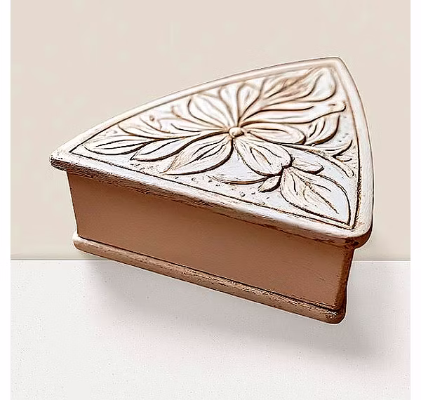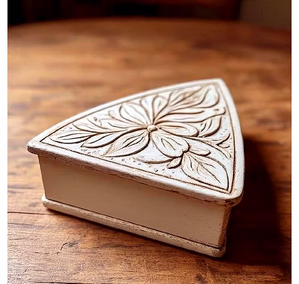 The Triangular Jewelry Box (Item Code: AKI426) in antique white finish is a handmade wooden jewelry box with a rare triangular design and delicate floral carvings. Sized 7x7x2.5 inches, it is ideal as a keepsake box, decorative storage box, vintage jewelry box, or luxury gift box.