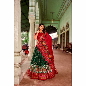 Introducing our exquisite Tussar Silk Lehenga Set: Patola Foil Print with Heavy Tassels. This stunning ensemble brings together traditional elegance with contemporary charm, making it the perfect choice for any special occasion. Crafted with care, the lehenga features a mesmerizing patola foil print that adds a touch of opulence. The intricate detailing and vibrant colors make it a true work of art, elevating your style quotient effortlessly. But it's not just the design that sets this lehenga apart. Made from premium quality Tussar silk, it offers a luxurious feel and drapes beautifully on any body type. The lightweight fabric ensures utmost comfort throughout the day, allowing you to dance, twirl, and celebrate with ease. The heavy tassels adorning the lehenga add a touch of glamour and playfulness, making you the center of attention wherever you go. The attention to detail is impeccable, ensuring that every element of this lehenga is a statement in itself. Whether you're attending a wedding, a festive celebration, or a special event, this Tussar Silk Lehenga Set will make you feel like a true queen. It is designed to make heads turn and hearts skip a beat. Invest in this timeless piece and let the world witness your impeccable sense of style. With its unique blend of tradition and modernity, this lehenga is sure to become the highlight of your wardrobe. Embrace the elegance, embrace the allure – choose our Tussar Silk Lehenga Set: Patola Foil Print with Heavy Tassels.