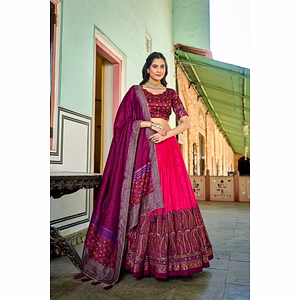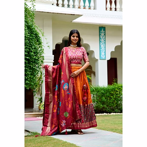 Introducing our exquisite Lehenga (Stitched) made from Tussar Silk, designed to make you stand out from the crowd. Crafted with precision, this Lehenga features a captivating Patola Print with Foil Work, adding a touch of elegance and sophistication. The drawstring with heavy tassels and zip closure ensures a secure and comfortable fit, while the stitched canvas, attached with Can Can, enhances the overall structure and flare. With a length of 42 inches and a generous flair of 3.80 meters, this Lehenga promises to make you look effortlessly graceful and mesmerizing. The inner lining, made from Micro Cotton, ensures utmost comfort throughout the day. Accompanying the Lehenga is the unstitched Blouse, made from the same Tussar Silk fabric. The Blouse features a stunning Patola Print with Foil Work, adding a touch of glamour to your ensemble. With a length of 0.80 meters, it offers ample fabric for customization to suit your style. Completing this ensemble is a Dupatta made from Tussar Silk, adorned with a beautiful Print and Foil Work. With a length of 2.5 meters, it can be draped in various styles to add an extra element of elegance to your look. Included in the package are the Lehenga, Blouse, Dupatta, drawstring with zip for convenience, and exquisite tassels for added flair. With a weight of 1.250 KG, this Lehenga set is the perfect choice for weddings, festive occasions, and special events. It effortlessly combines traditional craftsmanship with contemporary designs, making it a must-have in your wardrobe. Experience the allure of our Lehenga (Stitched) and be the center of attention at every occasion. Embrace style, comfort, and timeless beauty with this captivating ensemble.