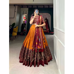 Lehenga(Stitched)Lehenga Fabric : Tussar SilkLehenga Work : Patola With Foil PrintLehenga Waist : SUPPORTED UP TO 42Lehenga Closer : Drawstring With Heavy Tassels and ZipStitching : Stitched With Canvas and attached with Can CanLength : 42Flair : 3.80 MeterInner : Micro Cotton|Blouse(Unstitched)Blouse fabric : Tussar SilkBlouse Work : Patola With Foil PrintBlouse Length : 0.80 MeterDupattaDupatta Fabric : Tussar SilkDupatta Work : Patola Printed With Both side TasselsDupatta Length : 2.5 MeterPackage Contain : Lehenga, Blouse, Dupatta, Drawstring with Zip, TasselsWeight : 1.260 KG Designed for international appeal, this top delivers both elegance and export-ready quality.