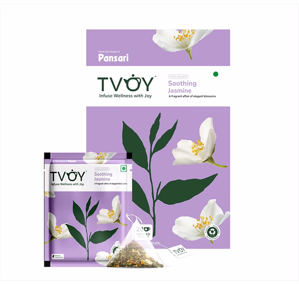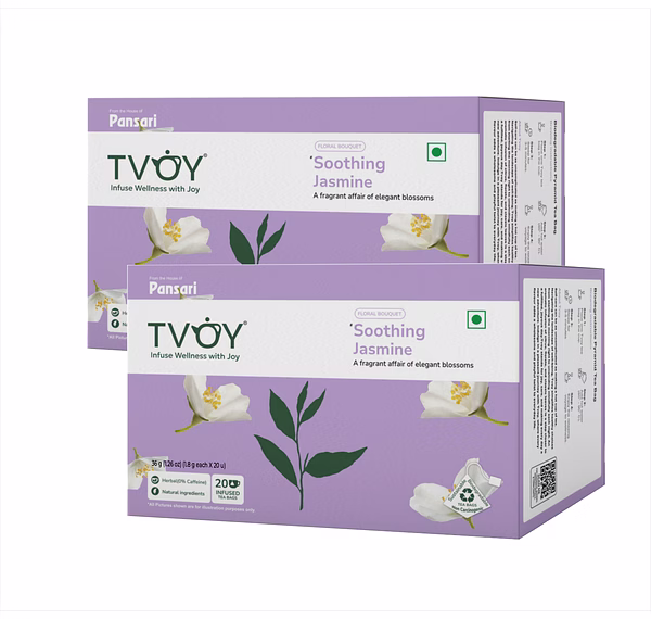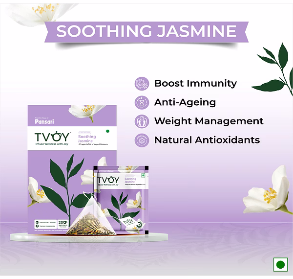 Experience tranquility with Tvoy Soothing Jasmine Tea, a delightful blend of green tea and floral jasmine flavor. Each sip offers a relaxing and aromatic experience.