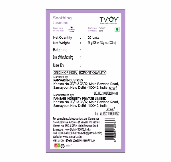Savor the convenience of 20 hygienically packed tea bags containing the perfect 1.8g portion. Enjoy a fragrant cup of Tvoy Soothing Jasmine Tea anytime, anywhere, elevating your tea rituals with ease.