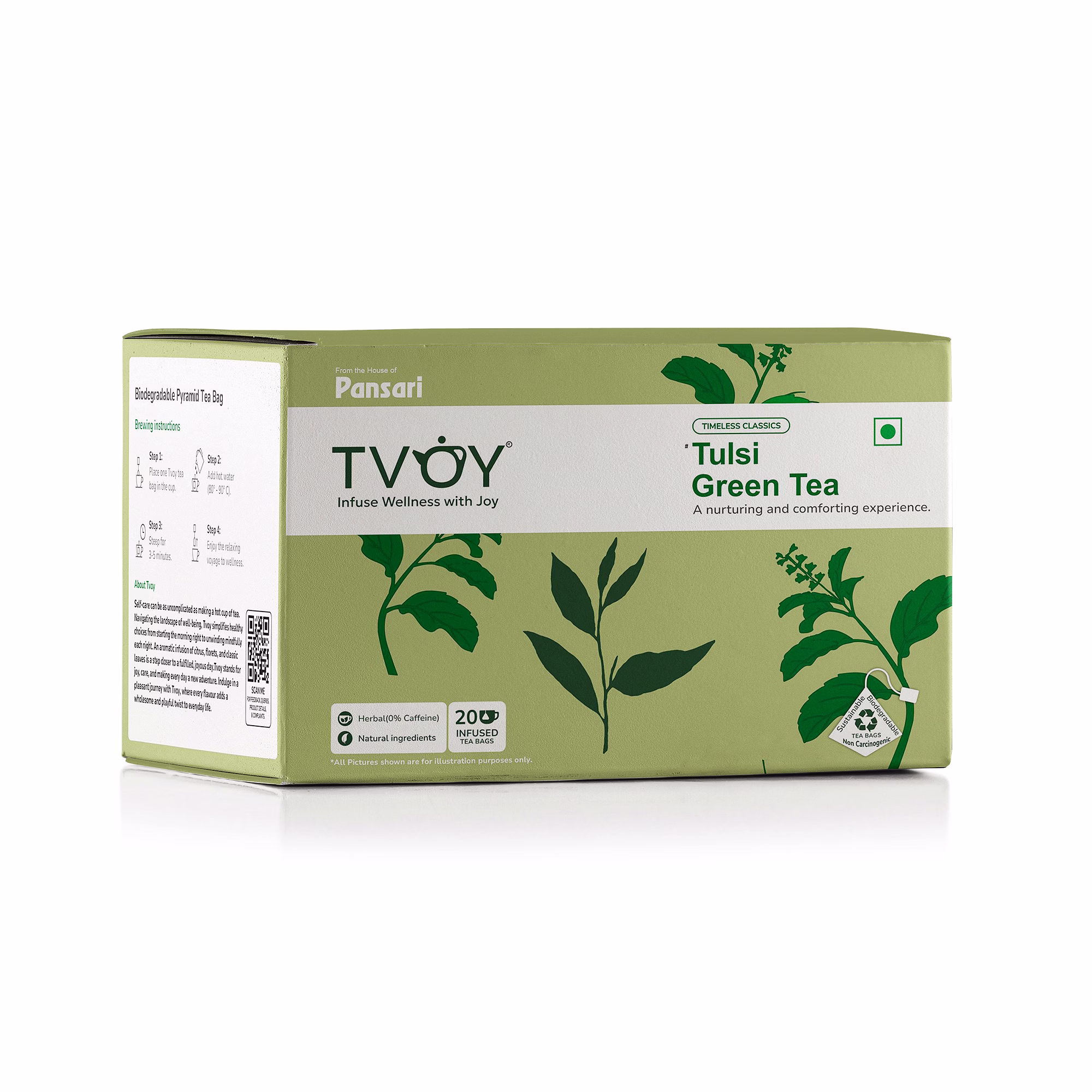 Tvoy Tulsi Green Tea – 1.8g x 20 Tea Bags is a refreshing blend of green tea infused with tulsi (holy basil), known for its herbal aroma and mild taste.