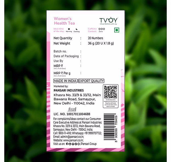 natural teaTvoy Women’s Health Tea – 1.8g x 20 Tea Bags is a herbal green tea blend crafted to provide a light and refreshing beverage suitable for daily consumption.