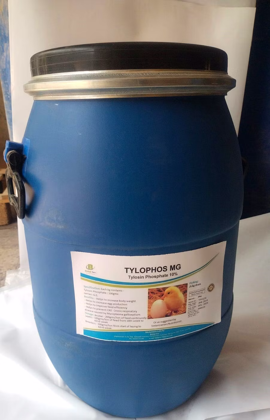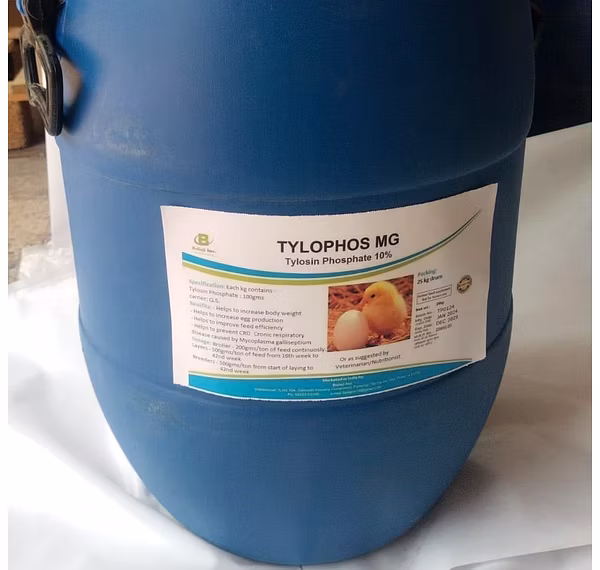TYLOPHOS MG is Tylosin phosphate 10% in granular form. Like other macrolides Tylophos MG has a bacteriostatic on susceptible organisms, caused by inhibition of protein synthesis through binding to the 50S subunit of the bacterial ribosome. Tylosin phosphate is used for veterinary purposes against bacterial dysentery and respiratory diseases in poultry, pigs and cattle. Tylosin phosphate exerts antibacterial effects by binding to 23S rRNA of the bacterial ribosomal 50S subunit. Tylosin is a commonly used in-feed antimicrobial and is approved in several countries to reduce the incidence of liver abscesses in beef cattle.