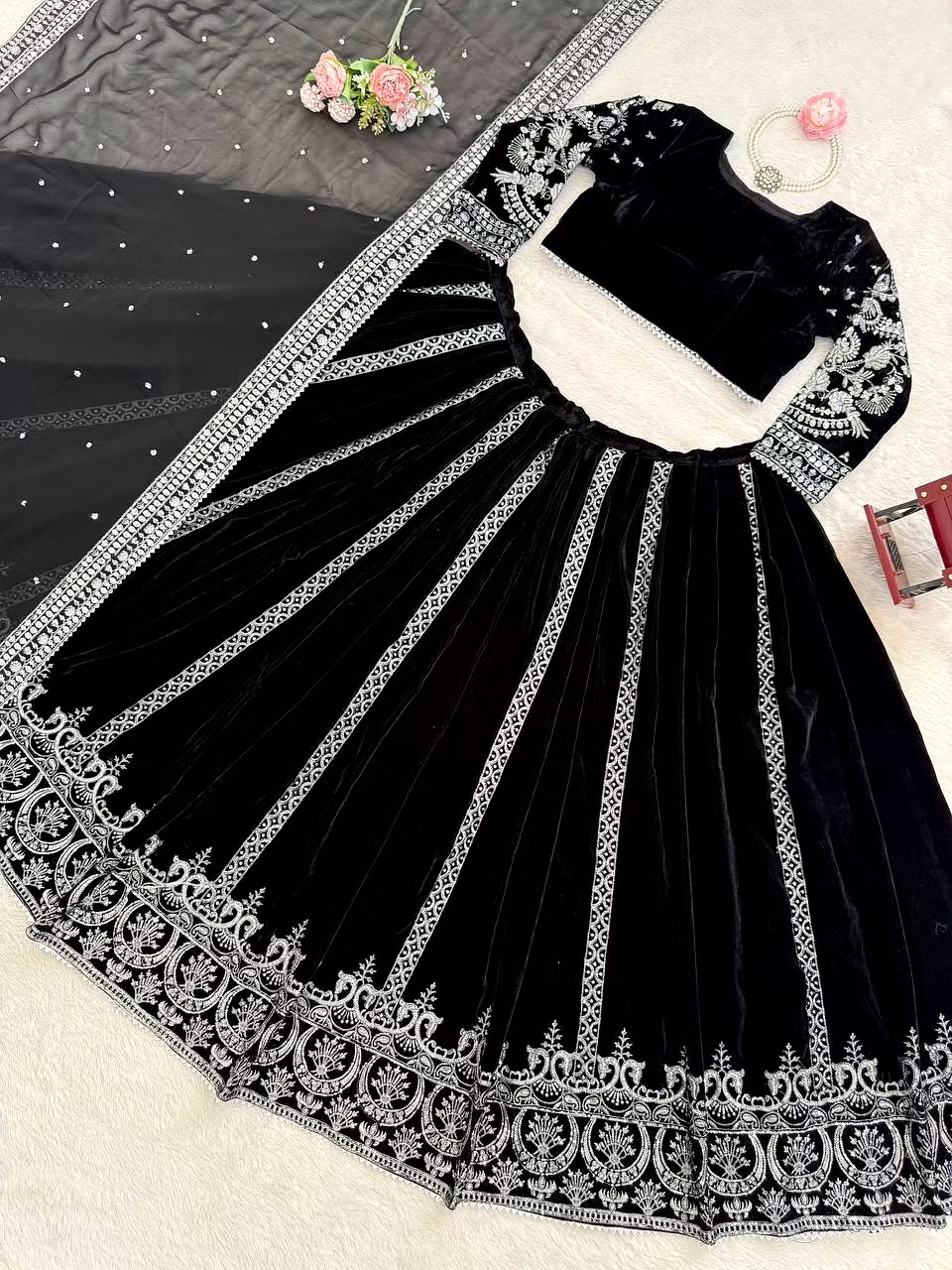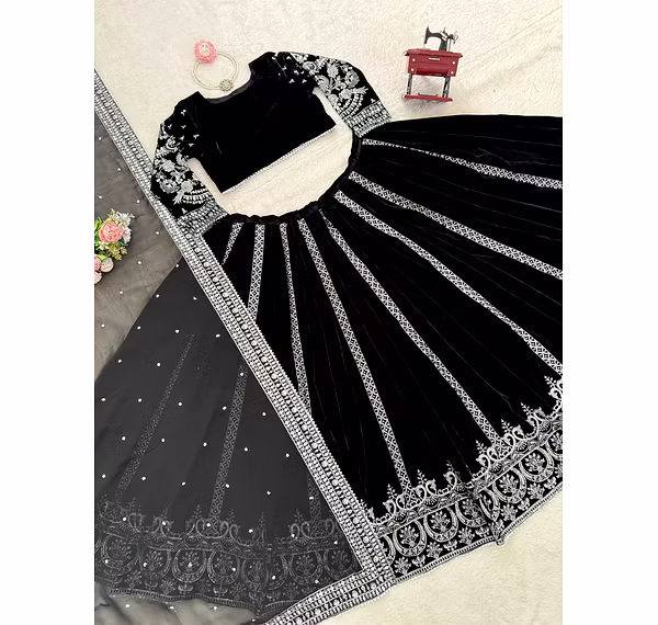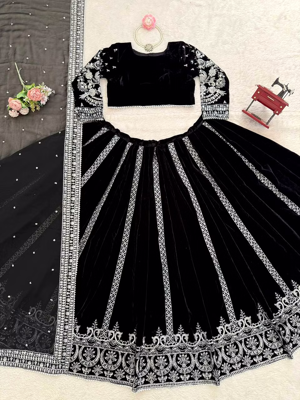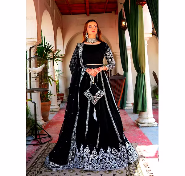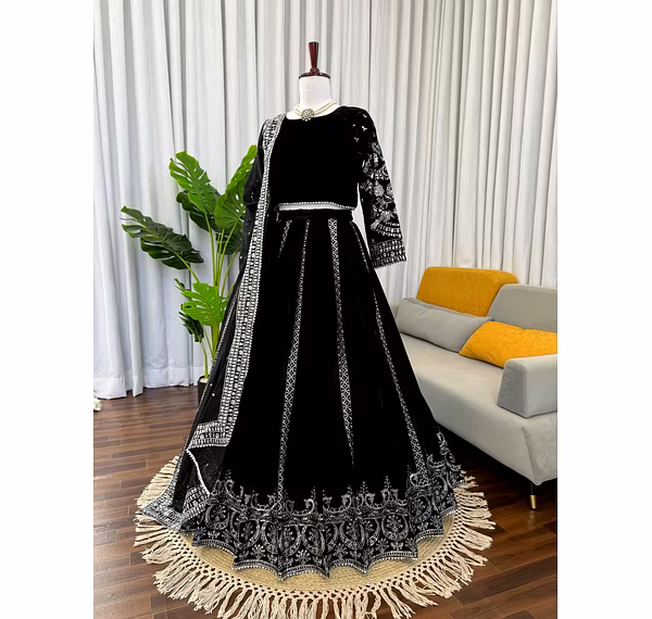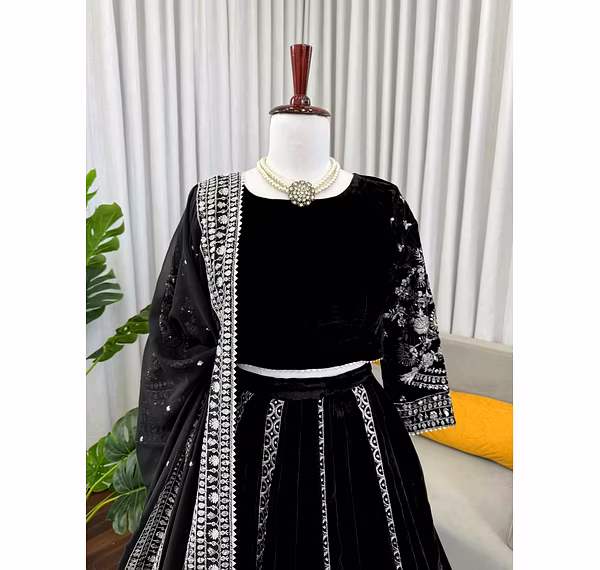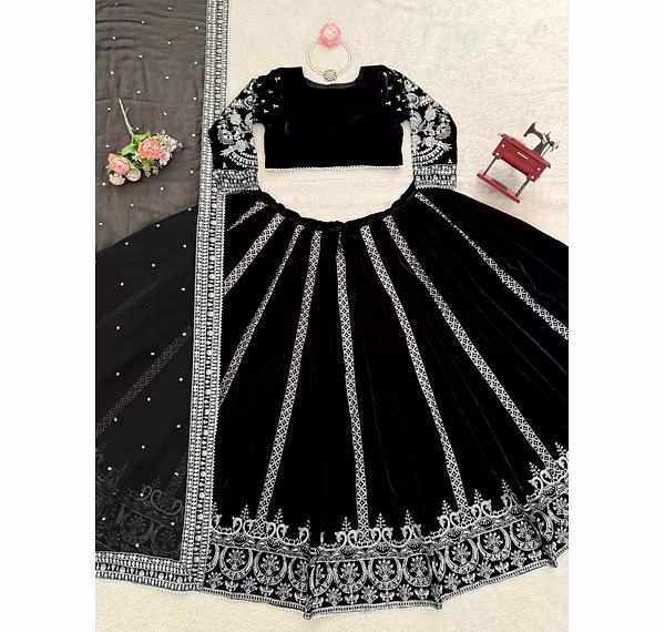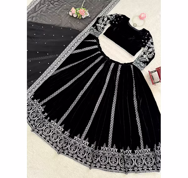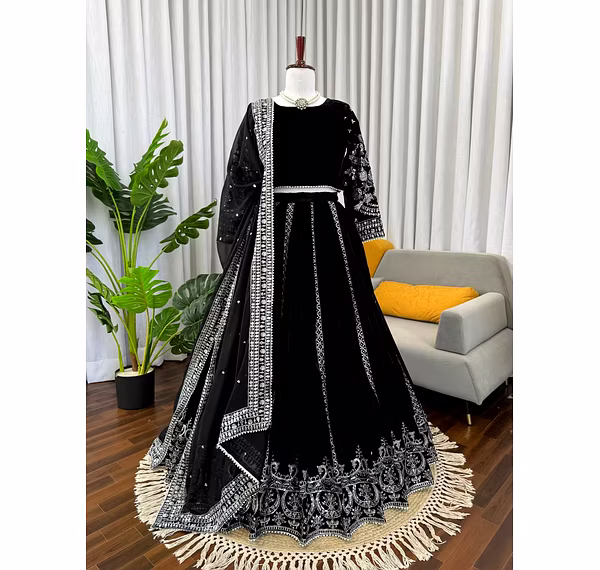 Dive into royalty with our Velvet Lehenga Choli with Dupatta, designed for opulent celebrations and winter weddings. Luxurious velvet fabric accented by intricate embroidery creates a regal ensemble that exudes elegance.