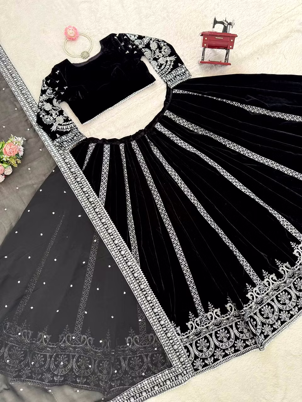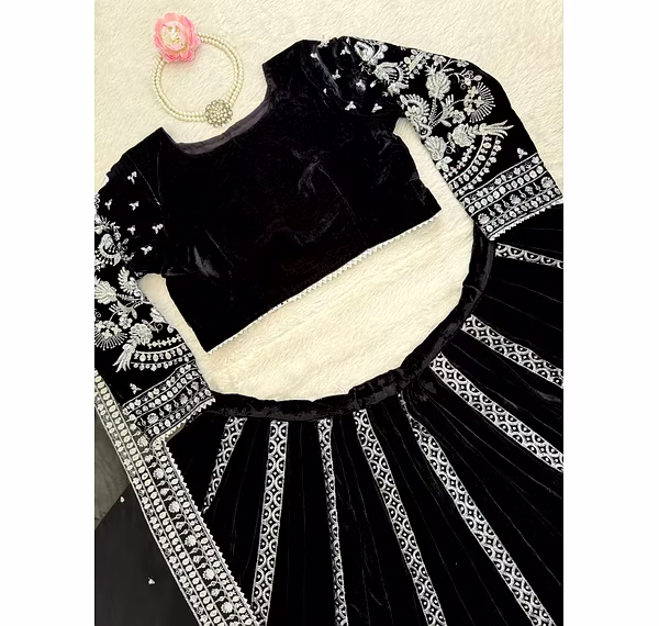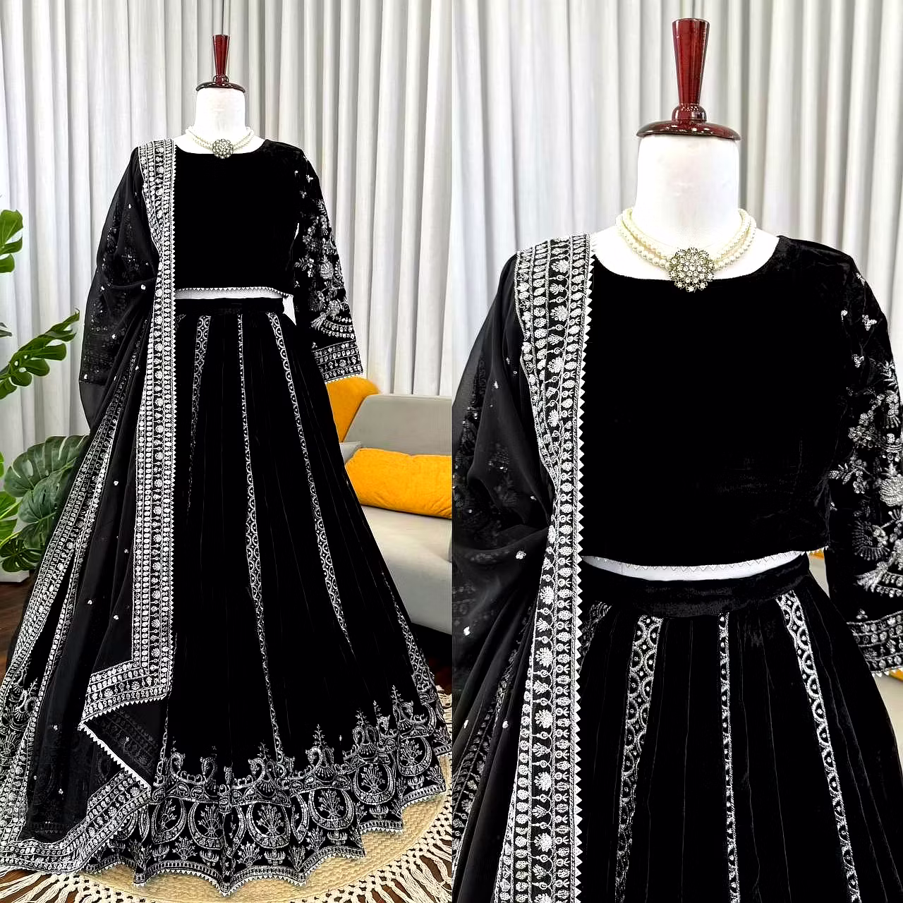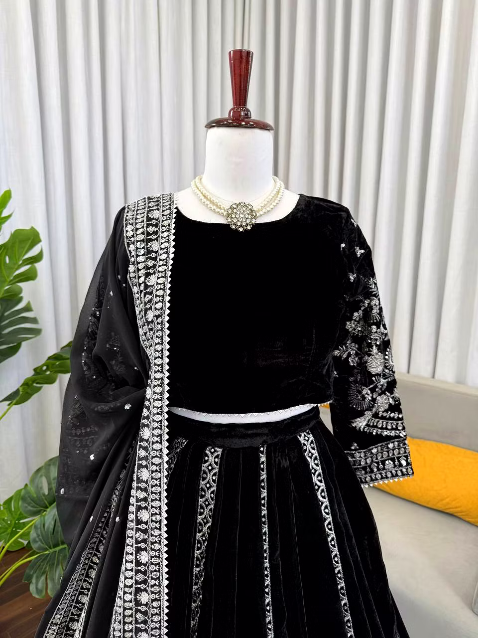 Step into winter glamour with our Velvet Lehenga Choli with Dupatta, a stunning ensemble that ensures warmth without compromising on style. Adorned with heavy embroidery and sequin work, this outfit is perfect for capturing radiant memories during festive evenings and special events.