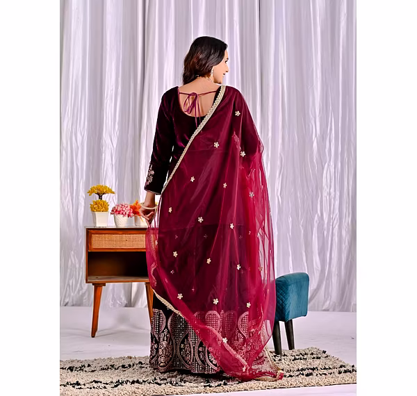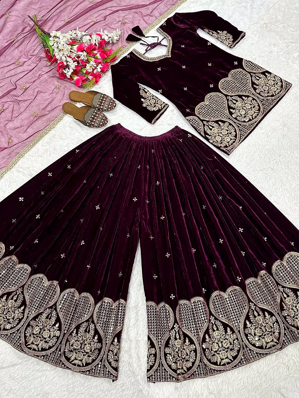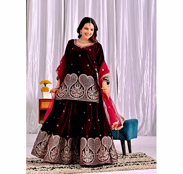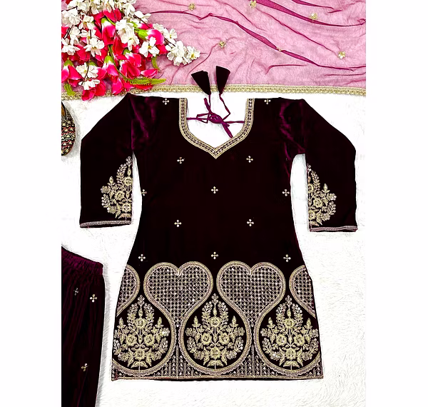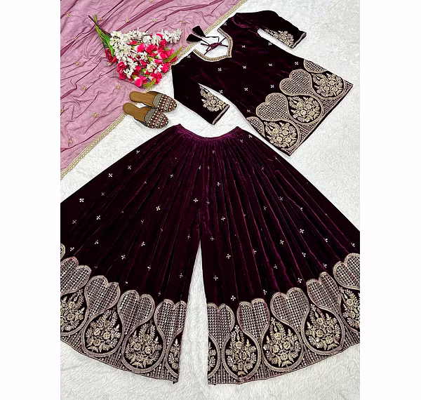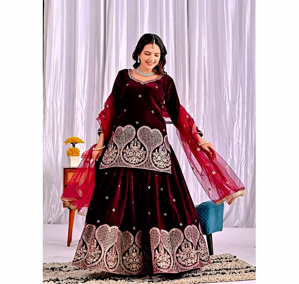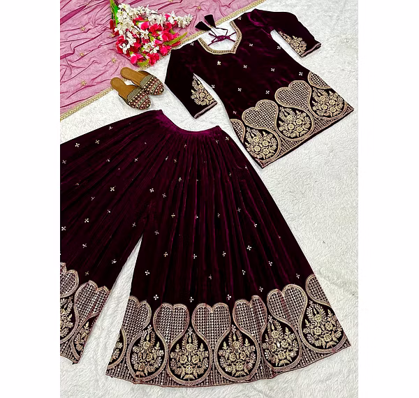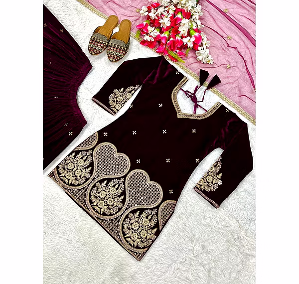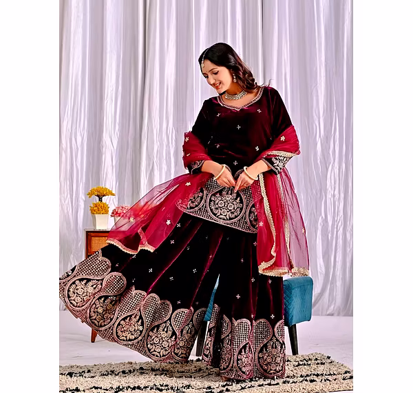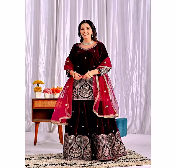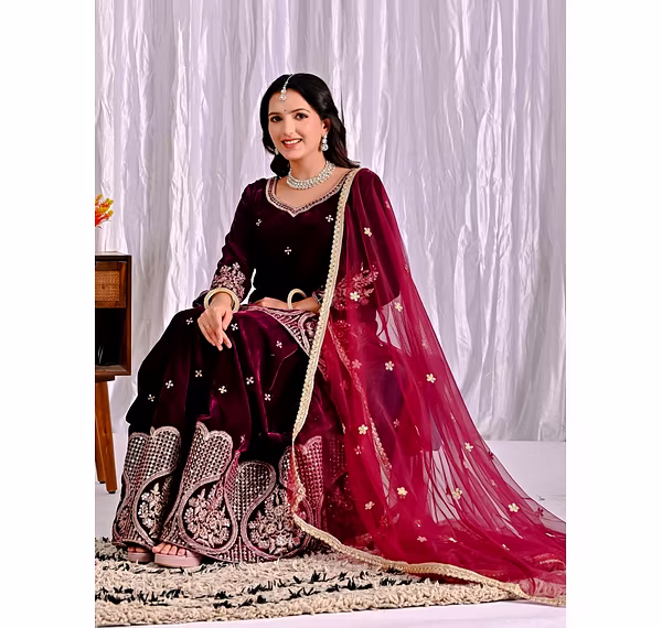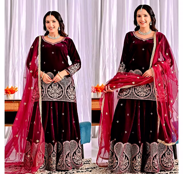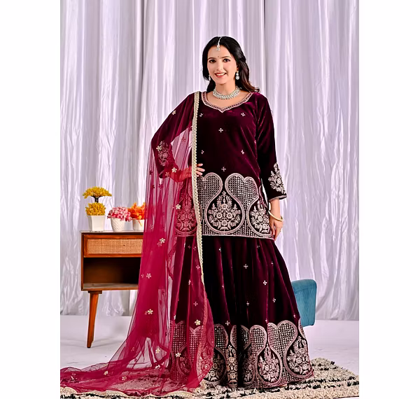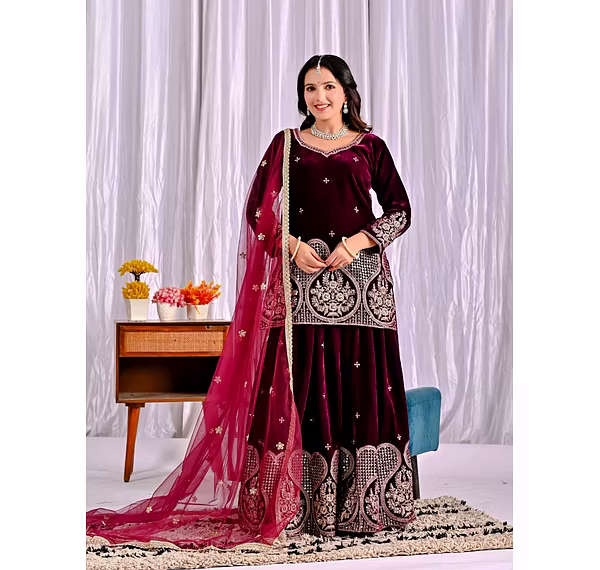 Step into the spotlight with the warm, glamorous, and exquisitely designed velvet sharara suit. Ideal for evening occasions, this outfit is a must-have for women who aspire to be bold, confident, and unforgettable in their fashion choices.
