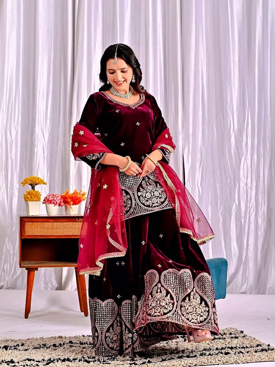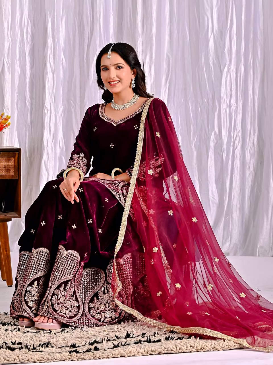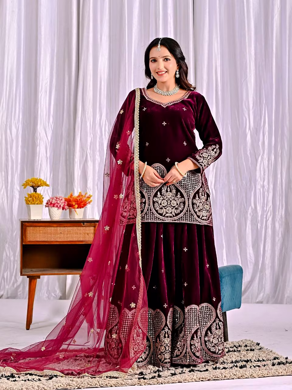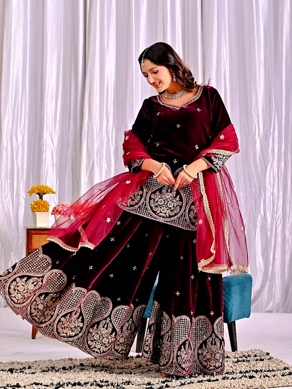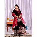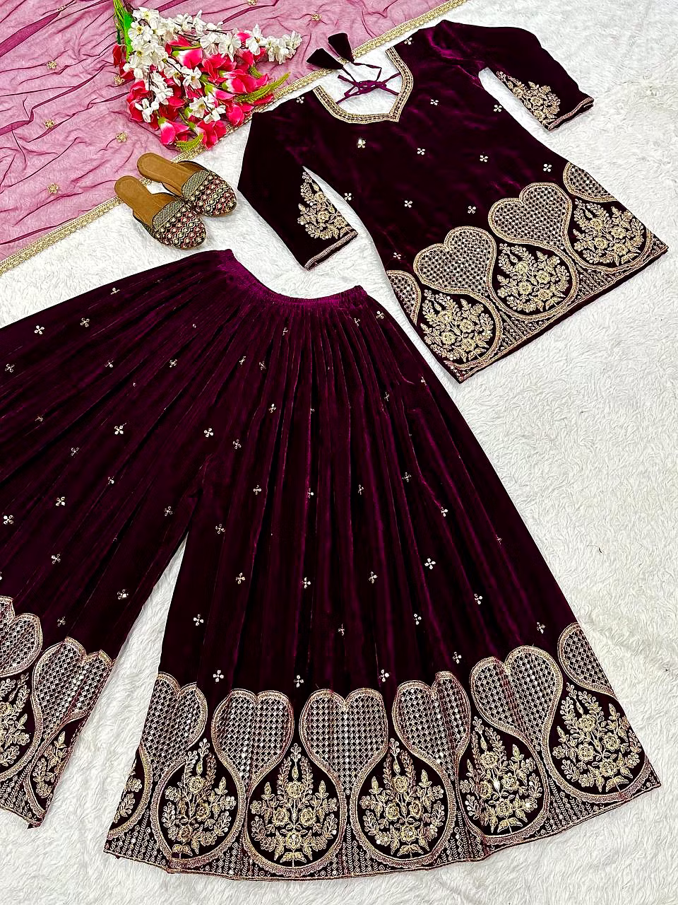 Step into the spotlight with the warm, glamorous, and exquisitely designed velvet sharara suit. Ideal for evening occasions, this outfit is a must-have for women who aspire to be bold, confident, and unforgettable in their fashion choices.