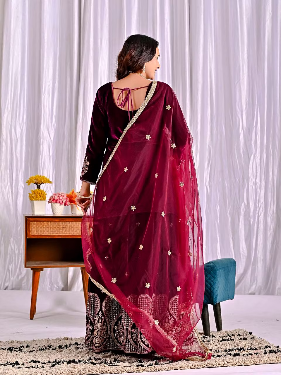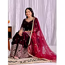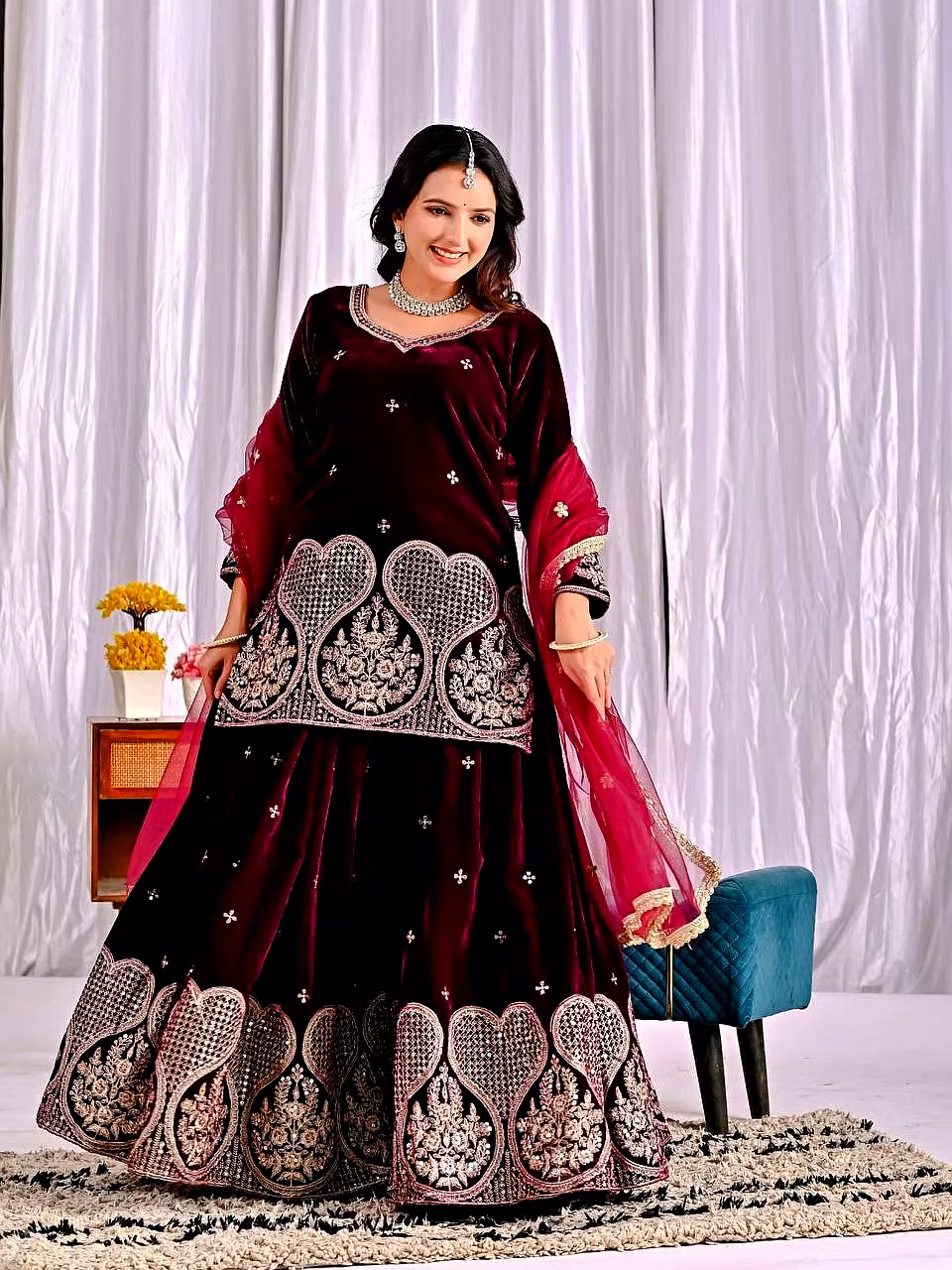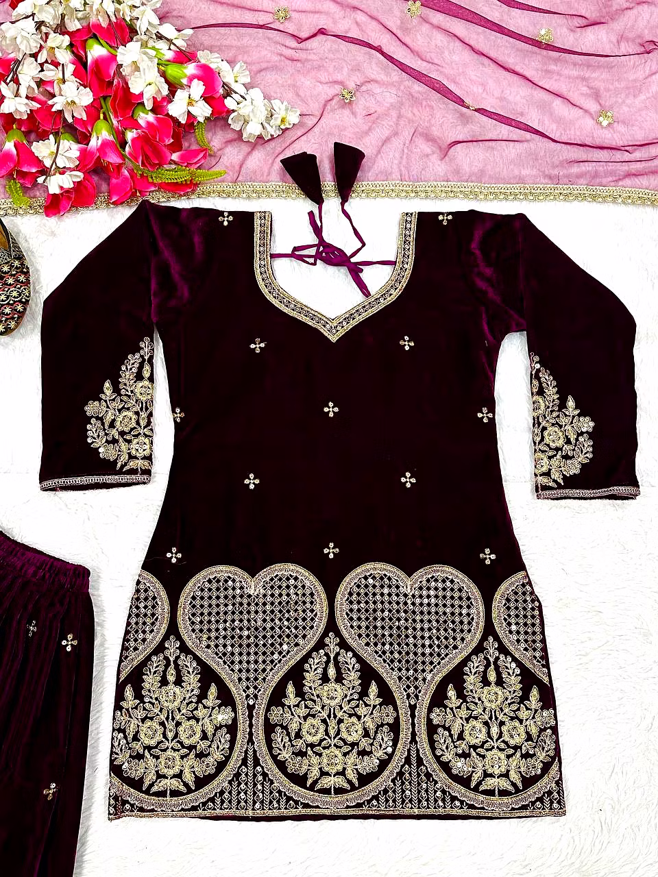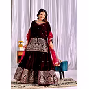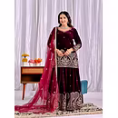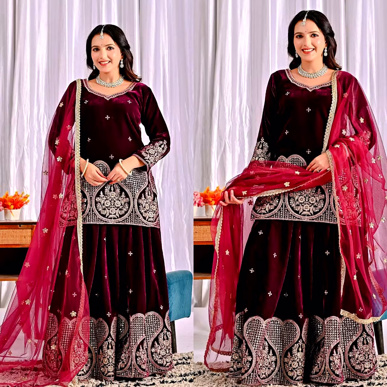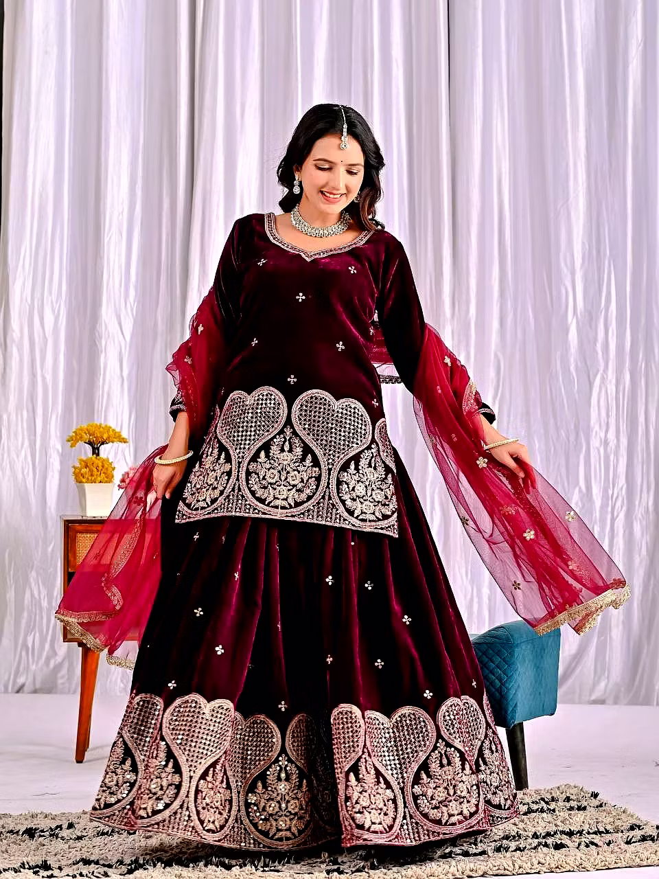 Step into the spotlight with the warm, glamorous, and exquisitely designed velvet sharara suit. Ideal for evening occasions, this outfit is a must-have for women who aspire to be bold, confident, and unforgettable in their fashion choices.