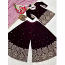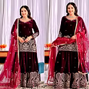 Indulge in royal opulence with this exquisite Velvet Sharara Suit Design, a blend of rich textures and festive allure. Perfect for winter weddings and grand celebrations.