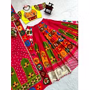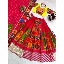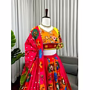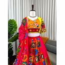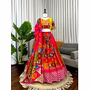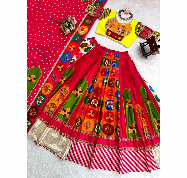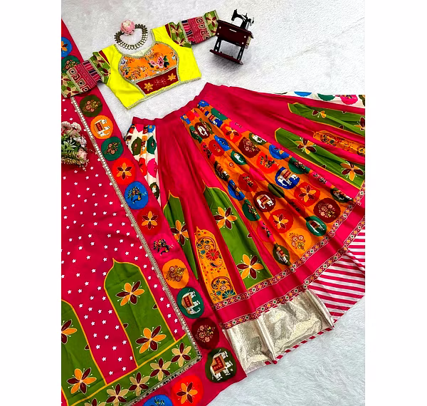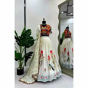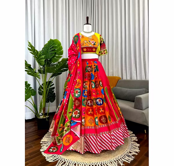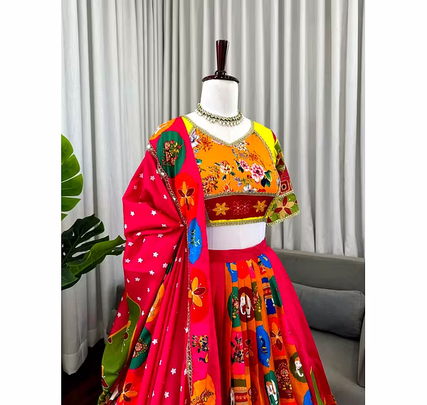 The eloquent crepe fabric gracefully drapes to accentuate movements, making it ideal for Navratri, festive events, and cultural celebrations. Each panel of this exquisite lehenga narrates a poignant tale through intricate digital prints and ethnic motifs.