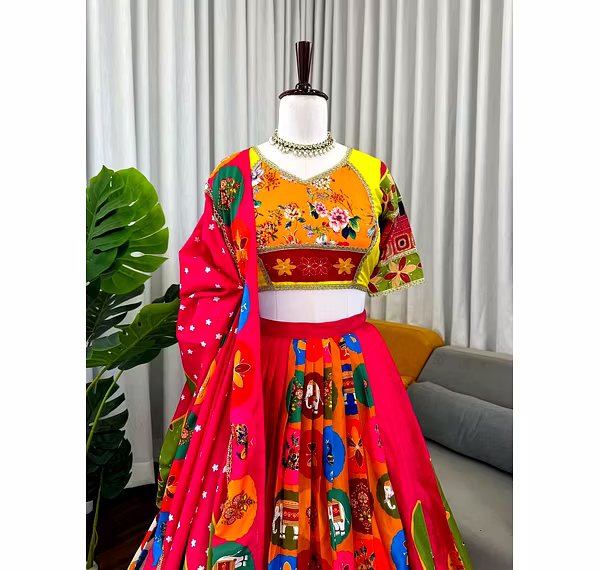 Celebrate life in full color with this Vibrant Digital Print Crepe Lehenga Choli. A joyous fusion of eclectic patterns, vivid hues, and artistic detailing tailored for the exuberant woman.