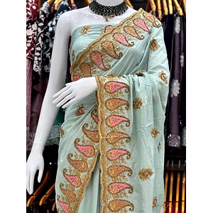 Introducing our exquisite Saree and Blouse set, crafted to elevate your style and make you the center of attention at any occasion. Made from high-quality Vichitra silk, this ensemble exudes elegance and grace. The Saree features a heavy zari work border adorned with intricate stone work, adding a touch of luxury and opulence to your look. The meticulous craftsmanship ensures that every detail shines, creating a mesmerizing effect that will leave everyone in awe. The matching Blouse is designed with a running work pattern that perfectly complements the Saree, creating a harmonious and sophisticated ensemble. The intricate work showcases our dedication to quality and excellence, ensuring that you look and feel your best. This Saree and Blouse set is not just a piece of clothing, but a statement of style and sophistication. Whether you're attending a wedding, a festive celebration, or any special occasion, this ensemble will make you stand out from the crowd. What sets this product apart is its unique combination of traditional craftsmanship and contemporary design. The heavy zari work and stone embellishments add a touch of tradition, while the modern silhouette and vibrant colors give it a fresh and trendy appeal. With our Saree and Blouse set, you can be confident in your fashion choices and leave a lasting impression wherever you go. Step into the spotlight and let this stunning ensemble be a reflection of your impeccable taste and individuality. In summary, our Saree and Blouse set is a masterpiece that combines beauty, elegance, and sophistication. Its heavy zari work, stone embellishments, and unique design make it a must-have for every fashion-forward woman. Be prepared to turn heads and make a lasting impression with this exquisite ensemble.