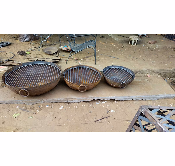 Enhance your culinary experience with this set of three Vintage Iron Kadai. Crafted with intricate jali design, these kadai are perfect for a variety of cooking needs.