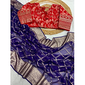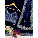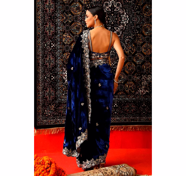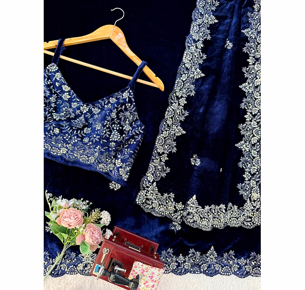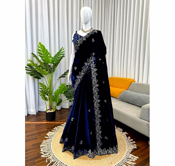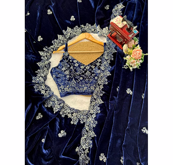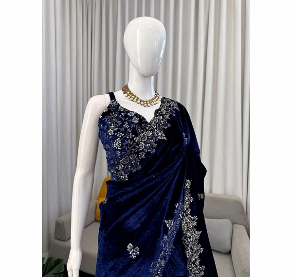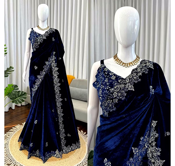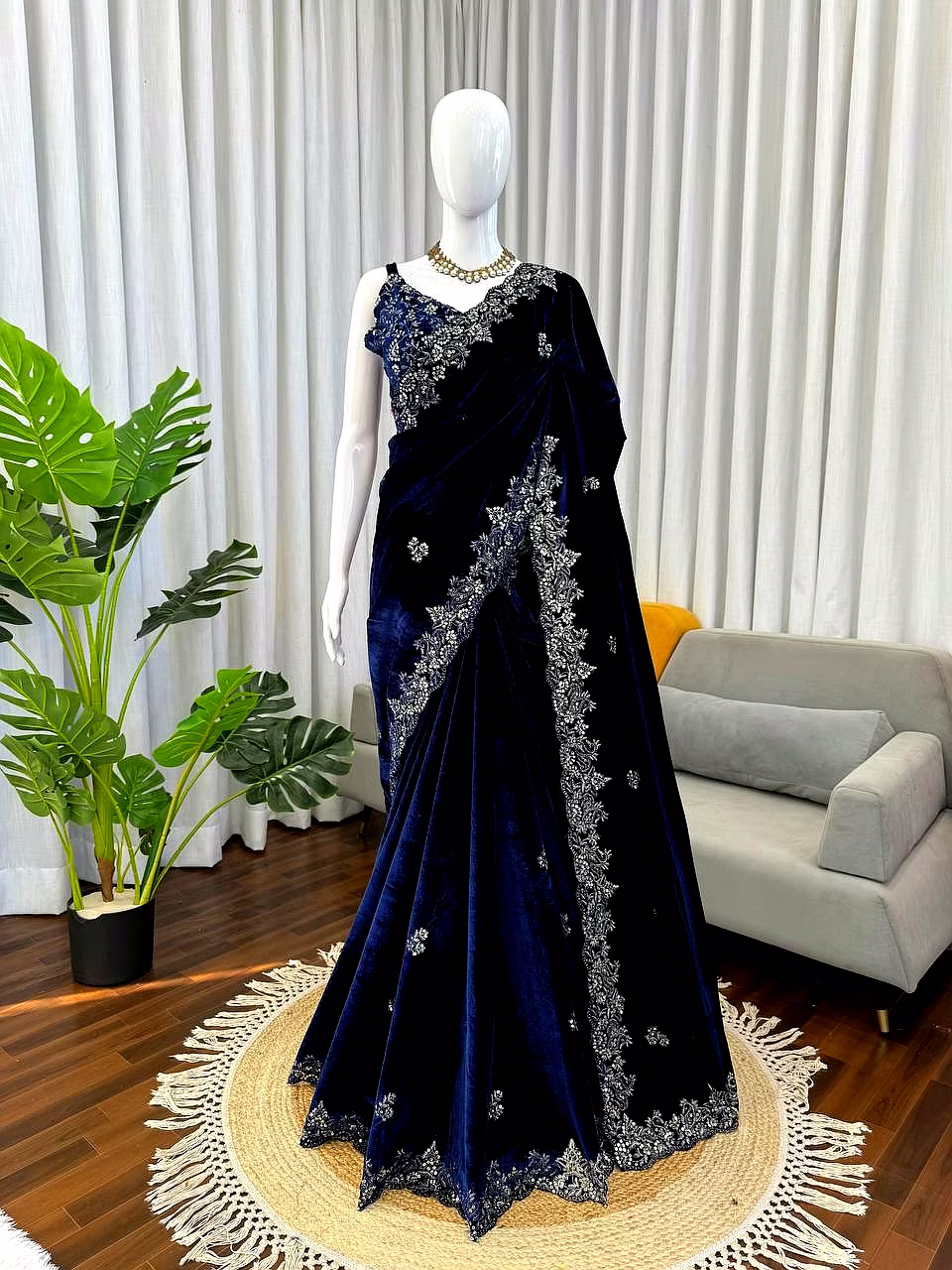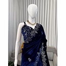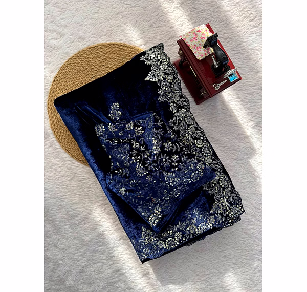 Dazzle at special occasions with our Party Wear Velvet Saree. The rich navy blue hue adds a touch of regal sophistication, making you the center of attention while reveling in the essence of luxury and glamour.