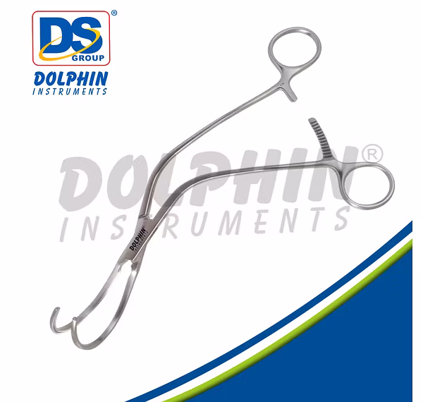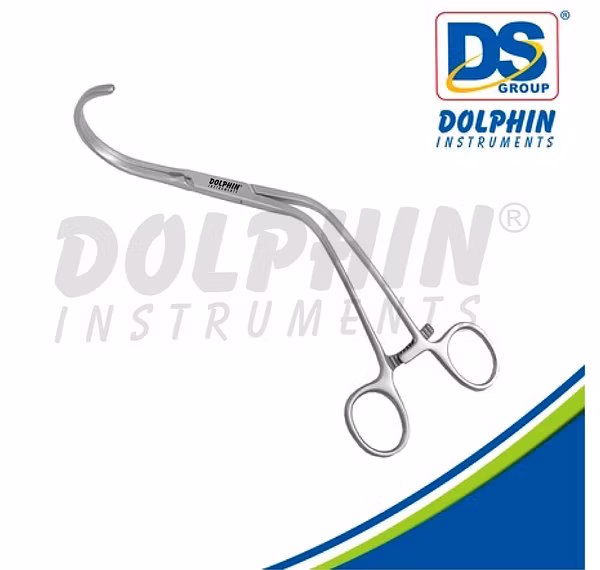 It features hook-like, serrated jaws to provide a secure, atraumatic grip without damaging the arterial wall, double-angled, 52mm curved blades for accessing deep tissues, and ergonomic, ratcheting handles for controlled manipulation.