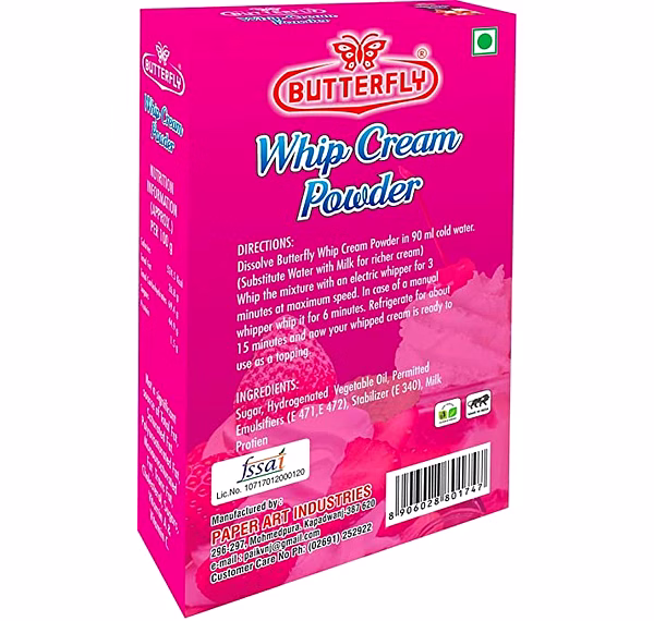 | Brand: BUTTERFLY Flavor: Vanilla Form: Powder Weight: 50 Grams Item Dimensions: LxWxH 8 x 3 x 13 Centimeters Allergen Information Almonds Free Diet Type: Vegetarian Package Weight: 90 Grams Material Type: Free Peanut: Free Package: Type Box |