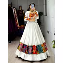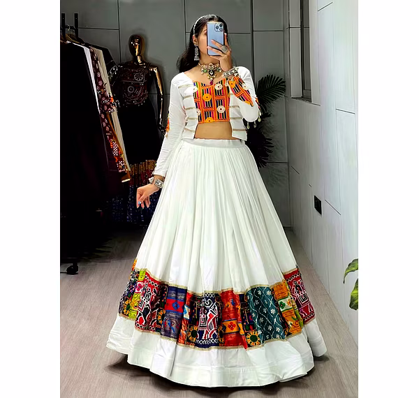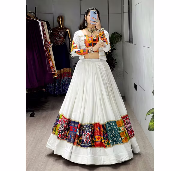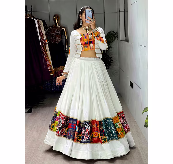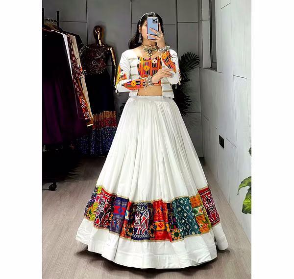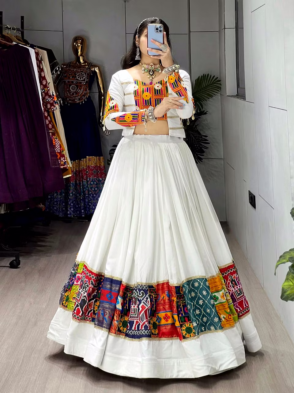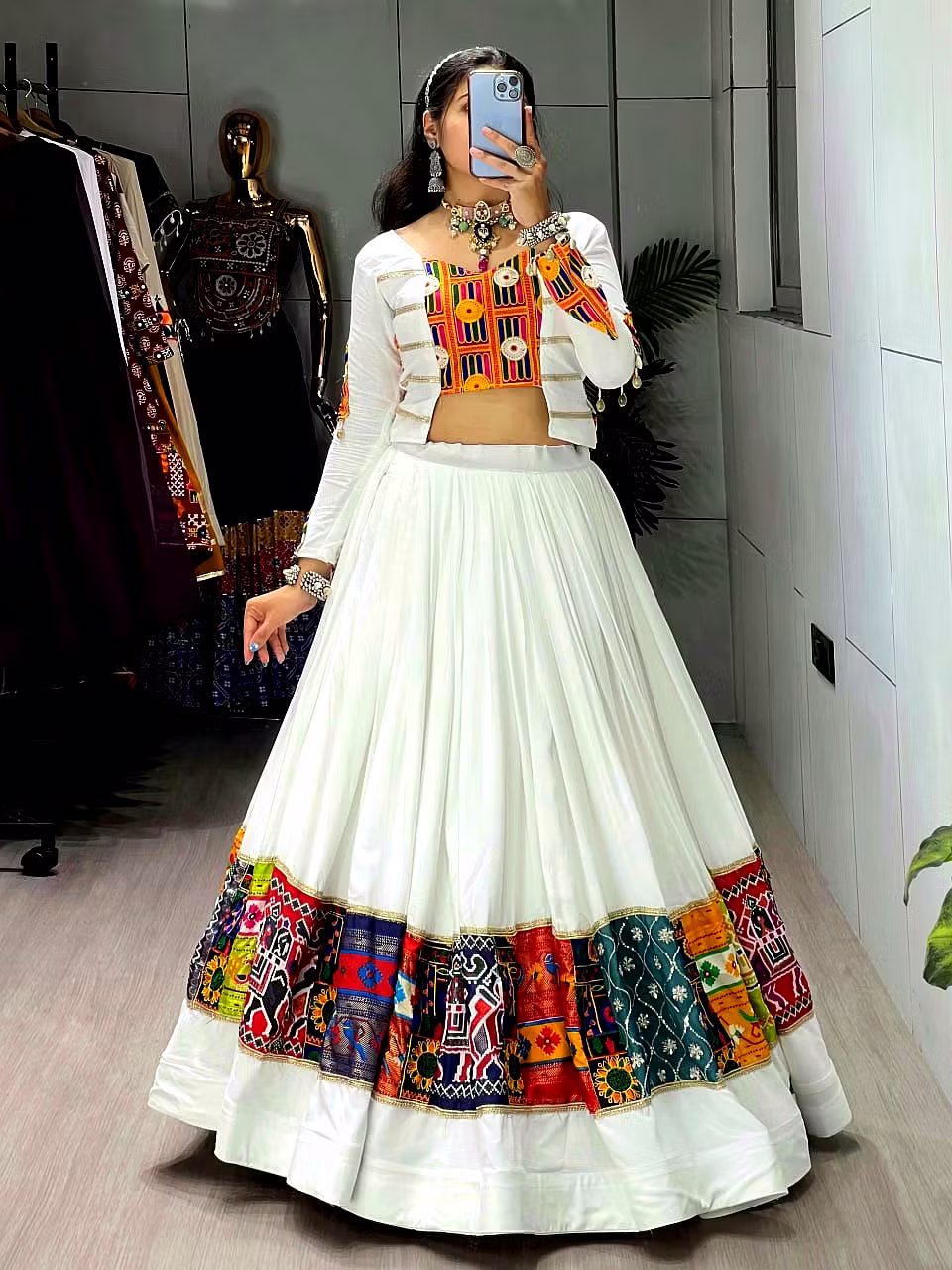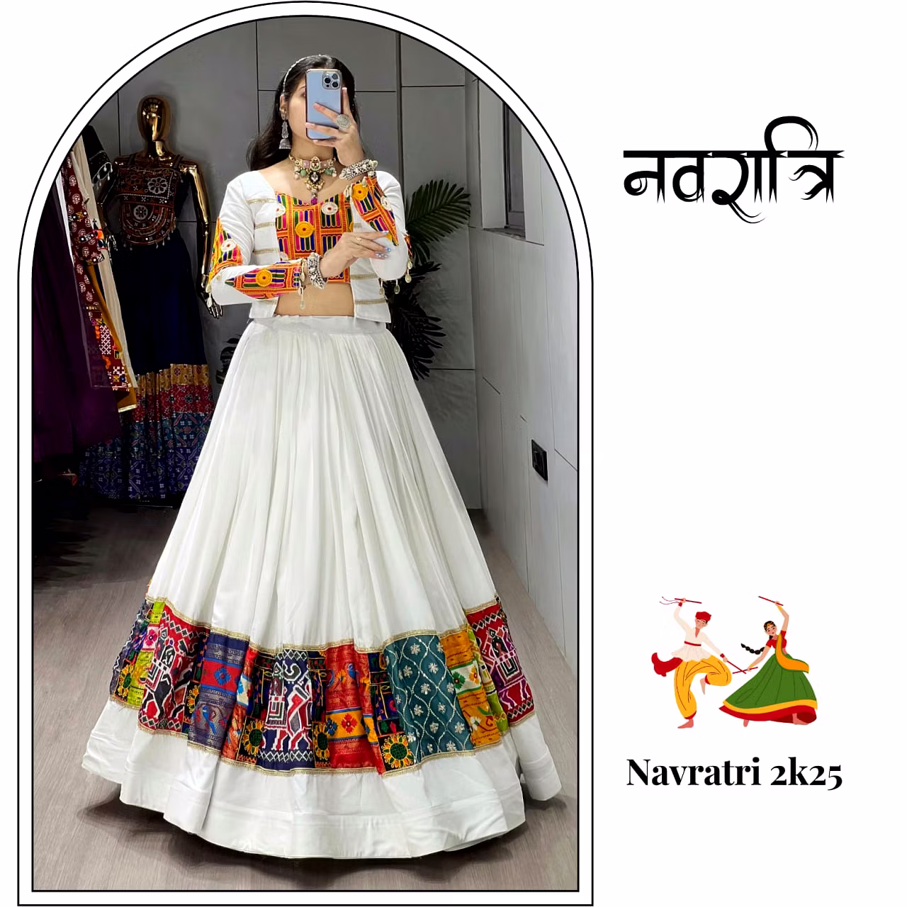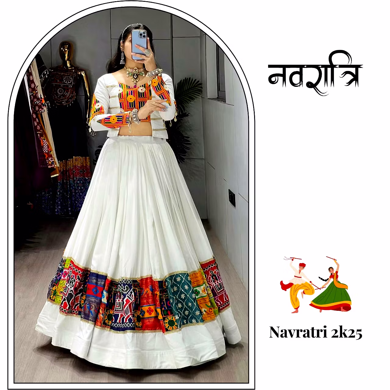 Celebrate Navratri in style with our exquisite White Chaniya Choli. Perfect for the festive season, this attire exudes elegance and traditional charm.