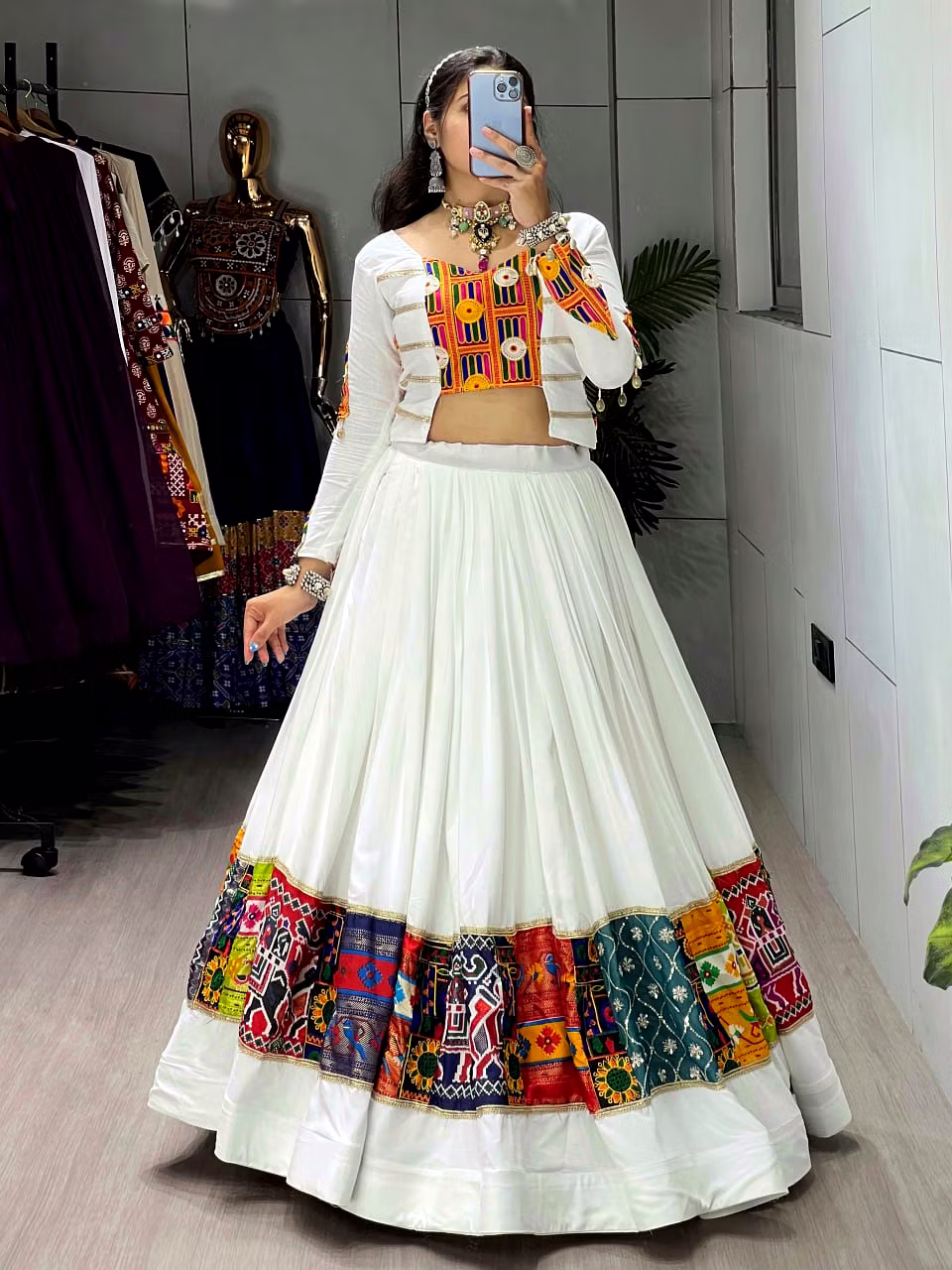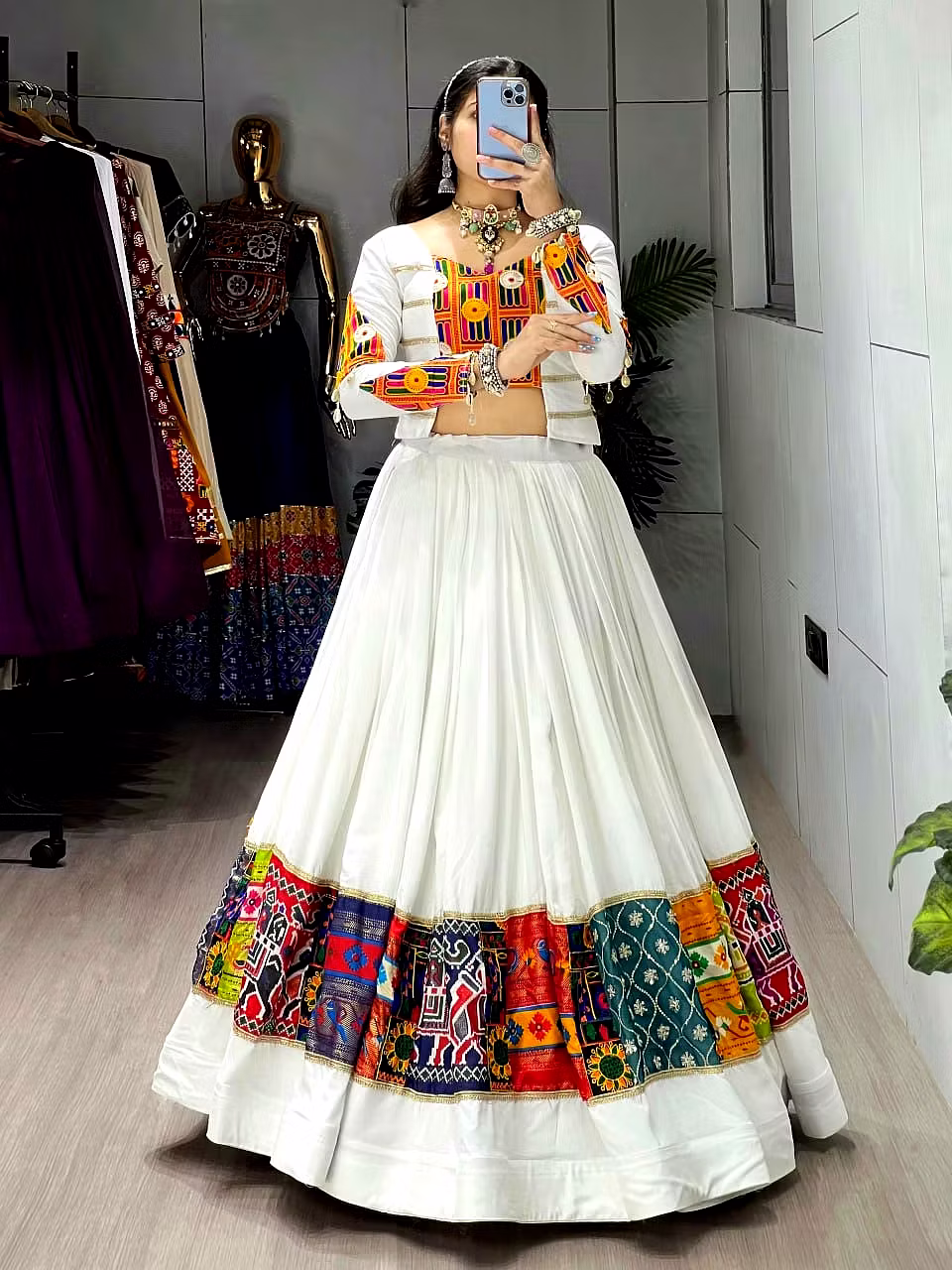 Step into the festive spirit with our intricately designed White Chaniya Choli. The perfect combination of modern style and traditional flair, this outfit will make you stand out at any Navratri celebration.
