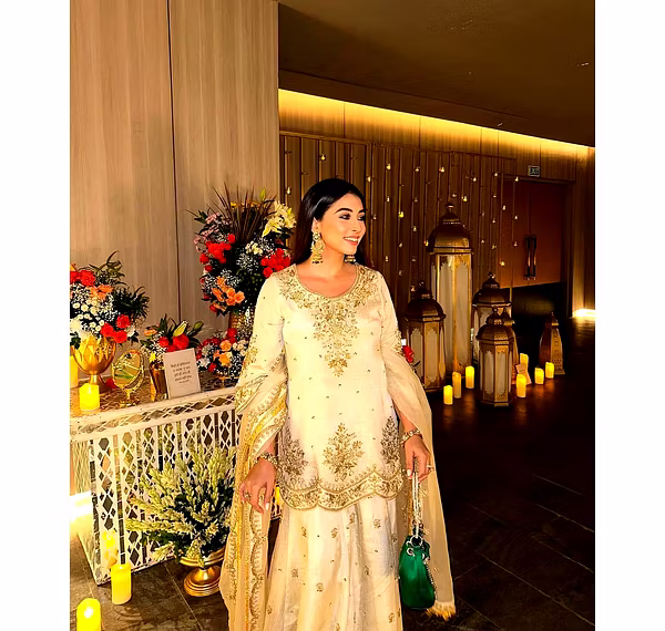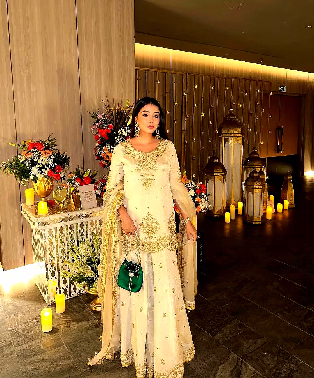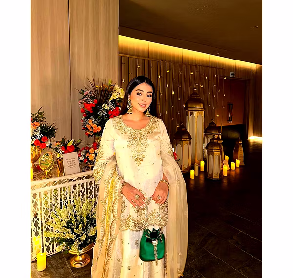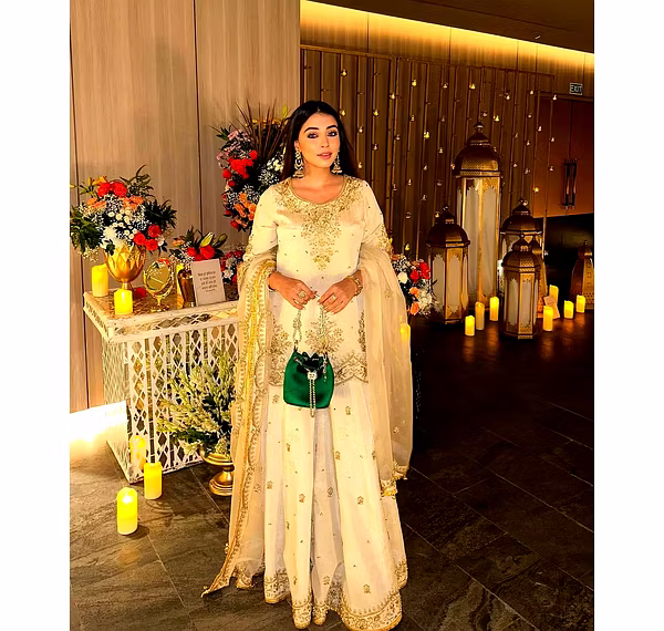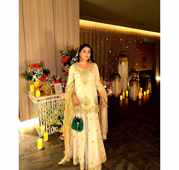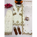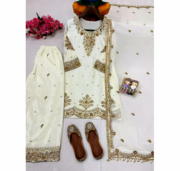 Step into timeless sophistication with this Chinon Silk ensemble. The delicate embroidery and intricate design details add a touch of feminine grace, perfect for special occasions or a stylish day out.