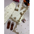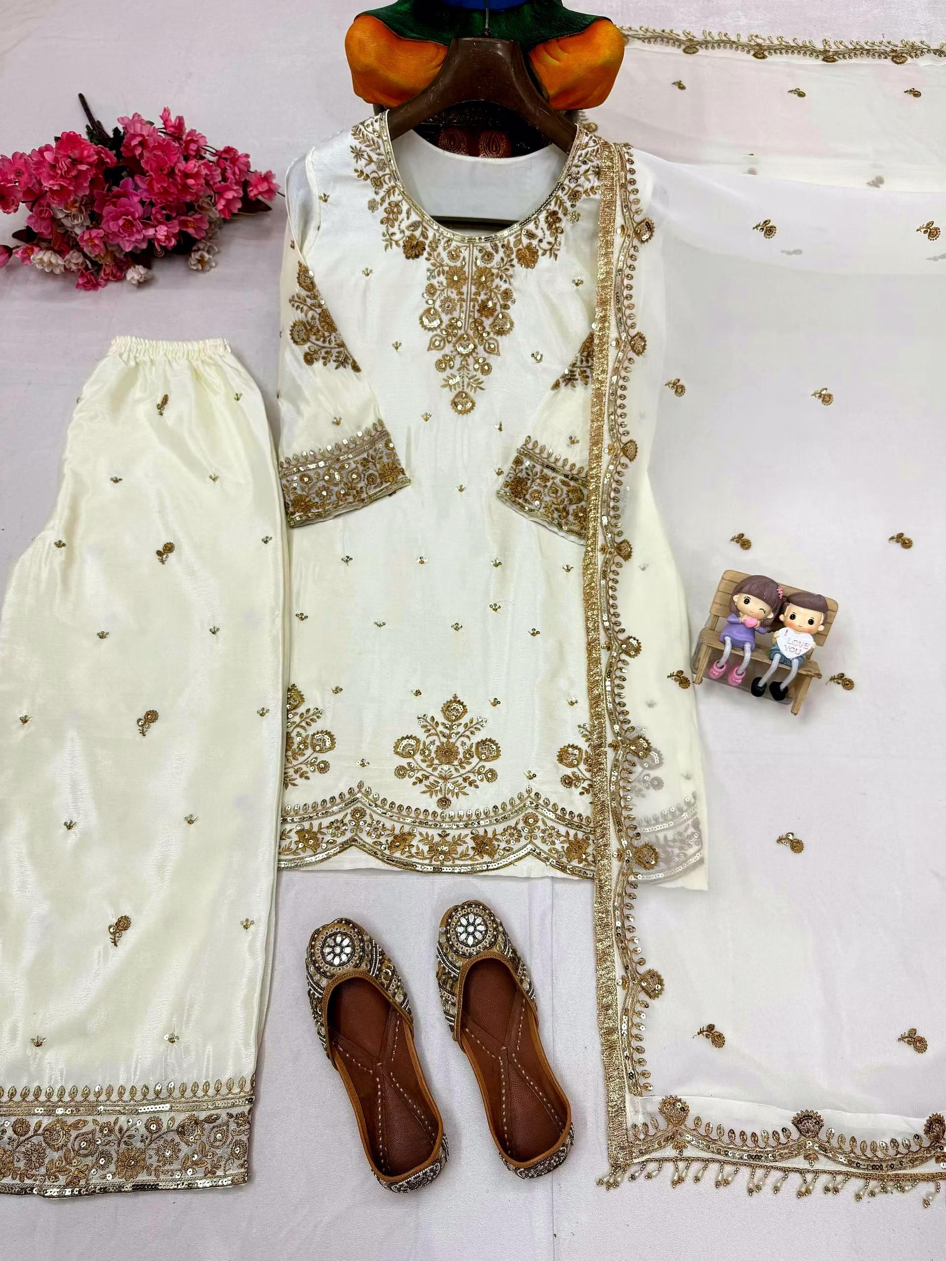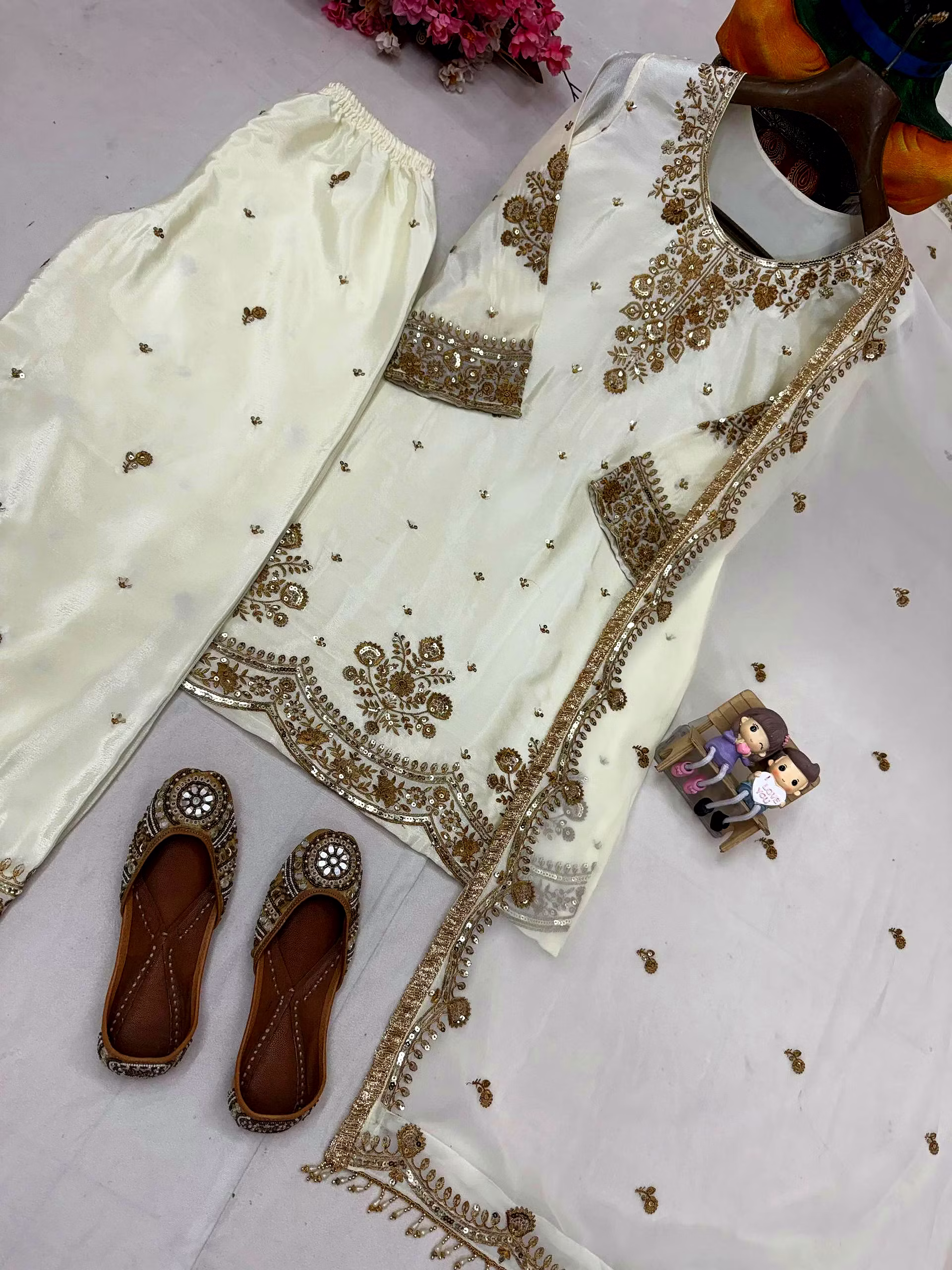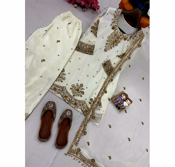 Indulge in the sheer elegance of our White Chinon Silk Kurti Set, meticulously crafted to enhance your style quotient. The luxurious fabric drapes gracefully, making every movement a statement of sophistication.