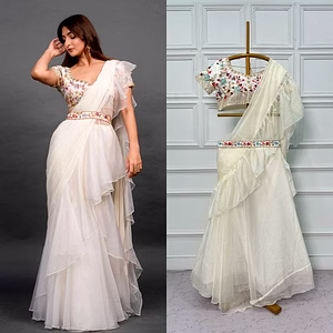 Elevate your ethnic wardrobe with our stunning White Net Lehenga Saree with Blouse. Experience elegance and charm in every drape.
