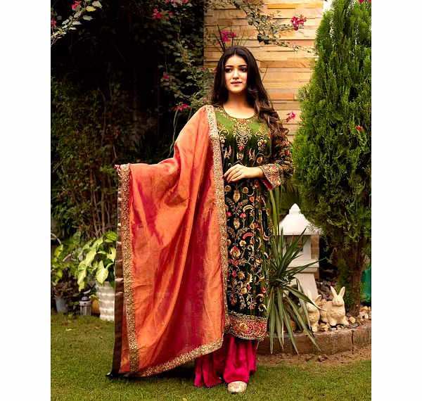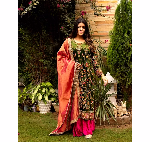 Versatile in its appeal, this velvet outfit is ideal for Mehendi ceremonies, winter weddings, festive dinners, and special gatherings. Experience the blend of traditional embroidery and modern design in this premium velvet masterpiece tailored for the discerning woman.