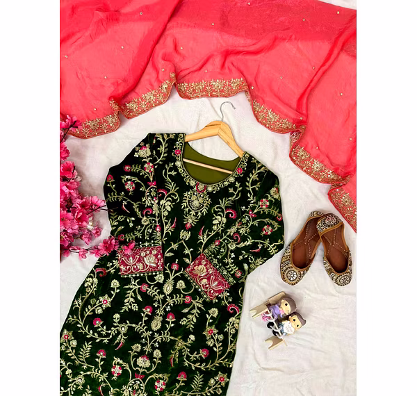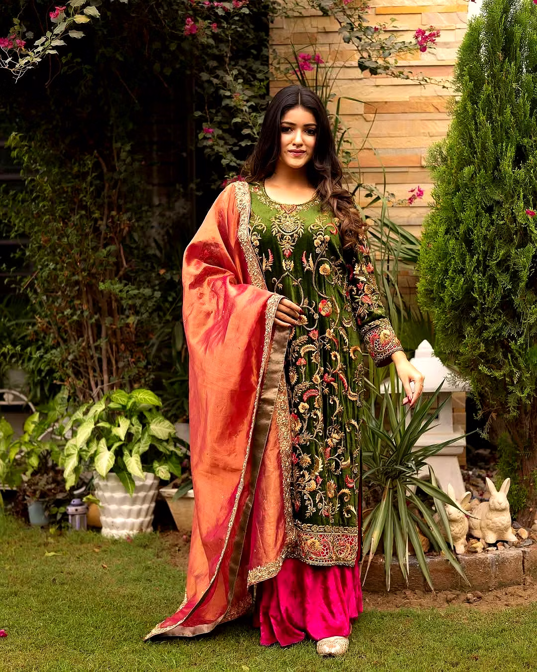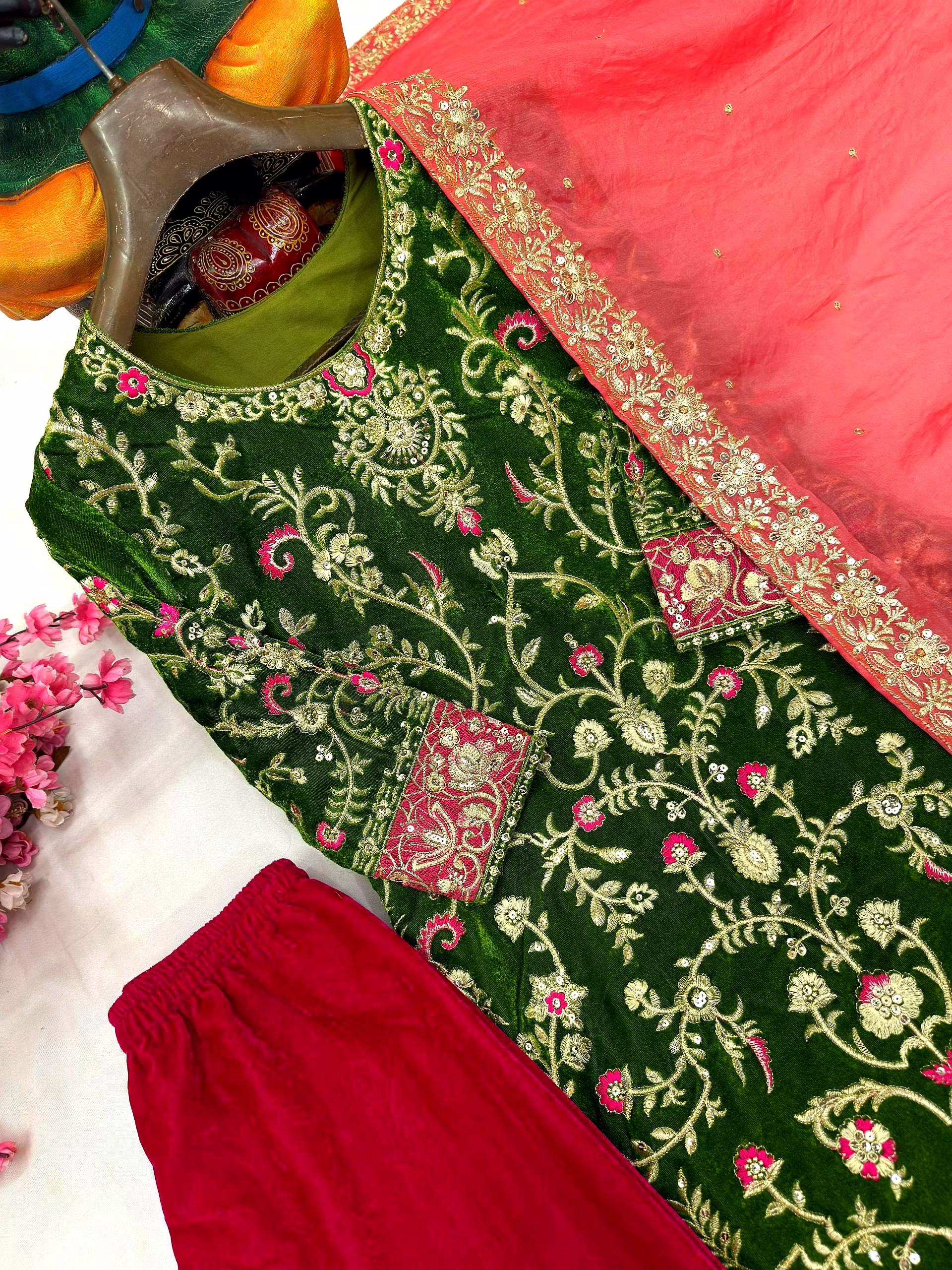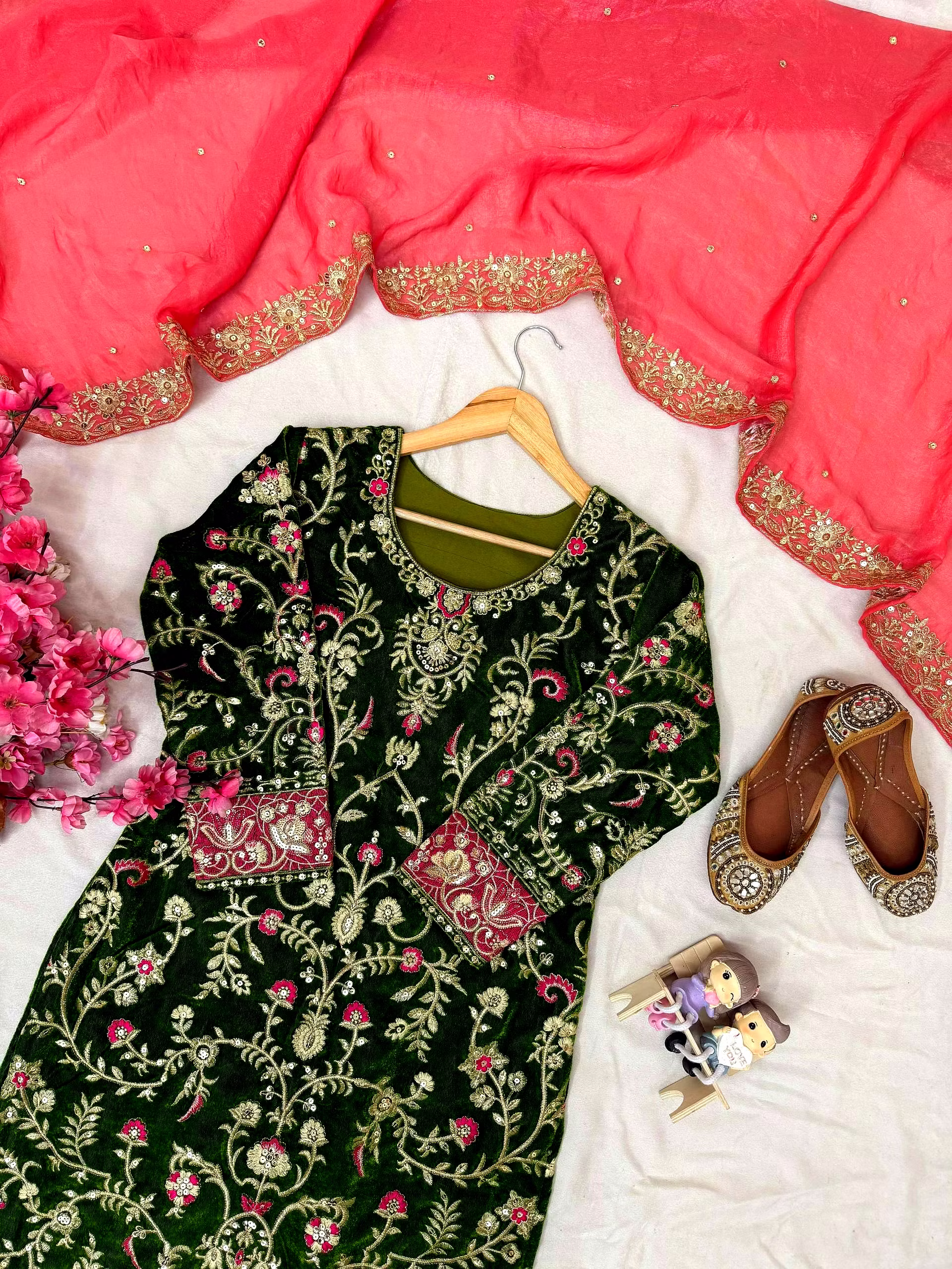 Step into elegance with our Winter Special Velvet Embroidery Work Dress for Mehendi, a deep green velvet outfit adorned with exquisite zari and resham embroidery inspired by Mughal motifs. The soft sheen of the velvet under lights creates a captivating allure, perfect for winter weddings and festive occasions.