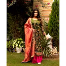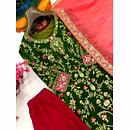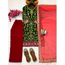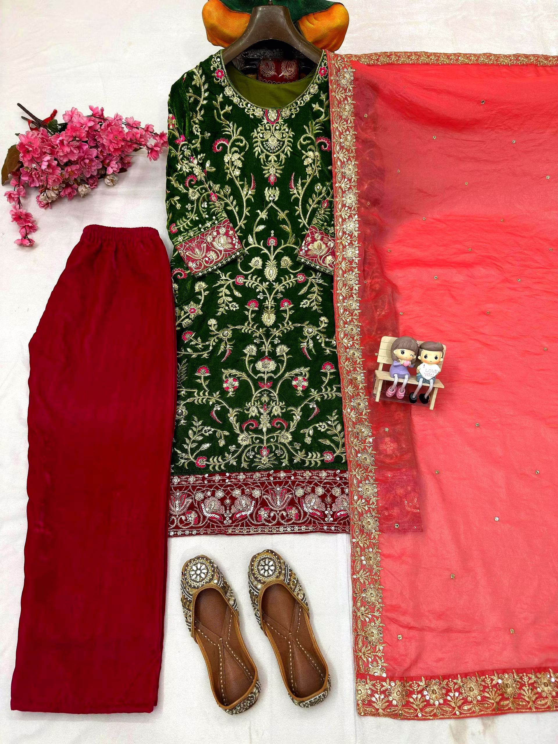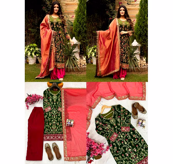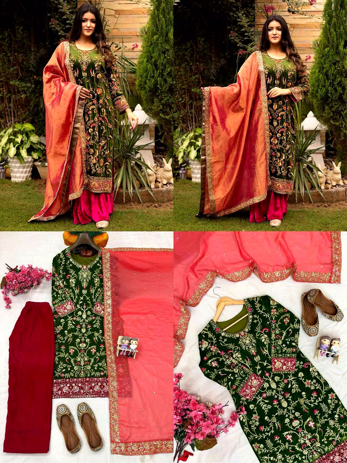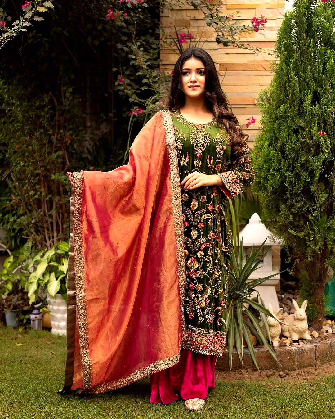 Step into elegance with our Winter Special Velvet Embroidery Work Dress for Mehendi, a deep green velvet outfit adorned with exquisite zari and resham embroidery inspired by Mughal motifs. The soft sheen of the velvet under lights creates a captivating allure, perfect for winter weddings and festive occasions.