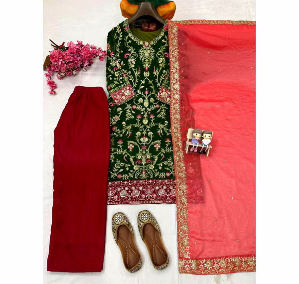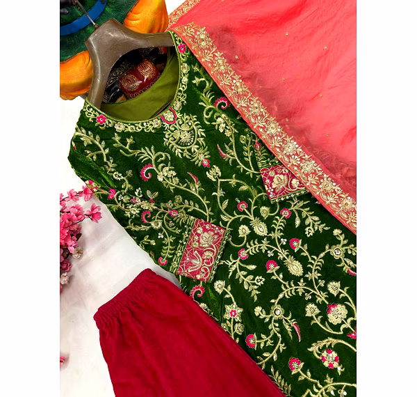The ensemble is paired with a rich contrast dupatta in rose-gold and magenta hues, elevating the look with a touch of luxury and sophistication. This plush velvet attire is completed with regal velvet trousers, offering comfort and grandeur in one timeless piece.
