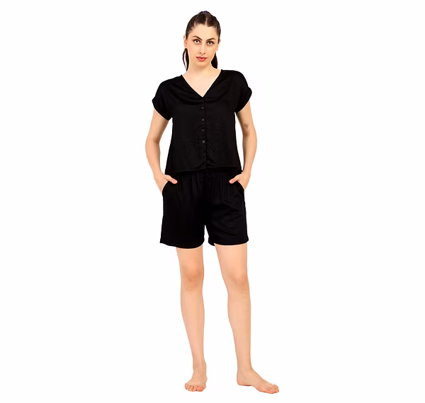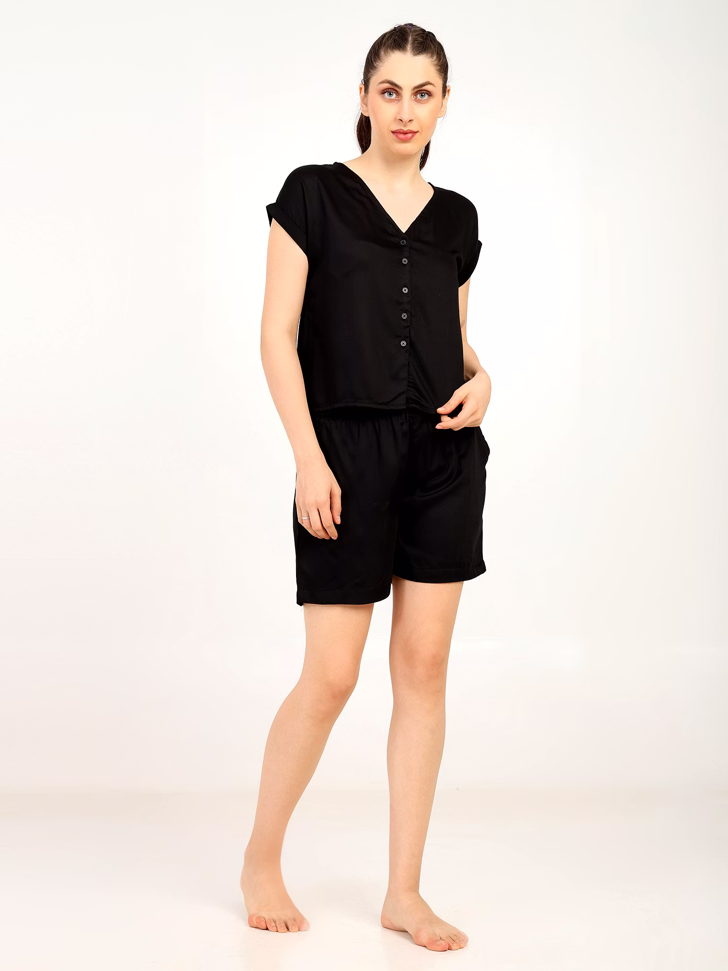 Women’s Modal Satin Night Suit – 2PC Soft Shirt & Shorts Sleepwear