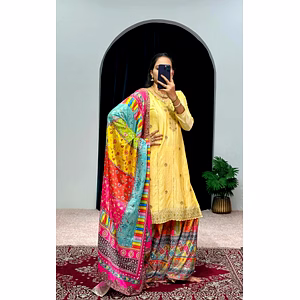 Enhance your ethnic elegance with our Yellow Chinon Silk Sharara Suit featuring intricate mirror work. Perfect for weddings and special occasions.